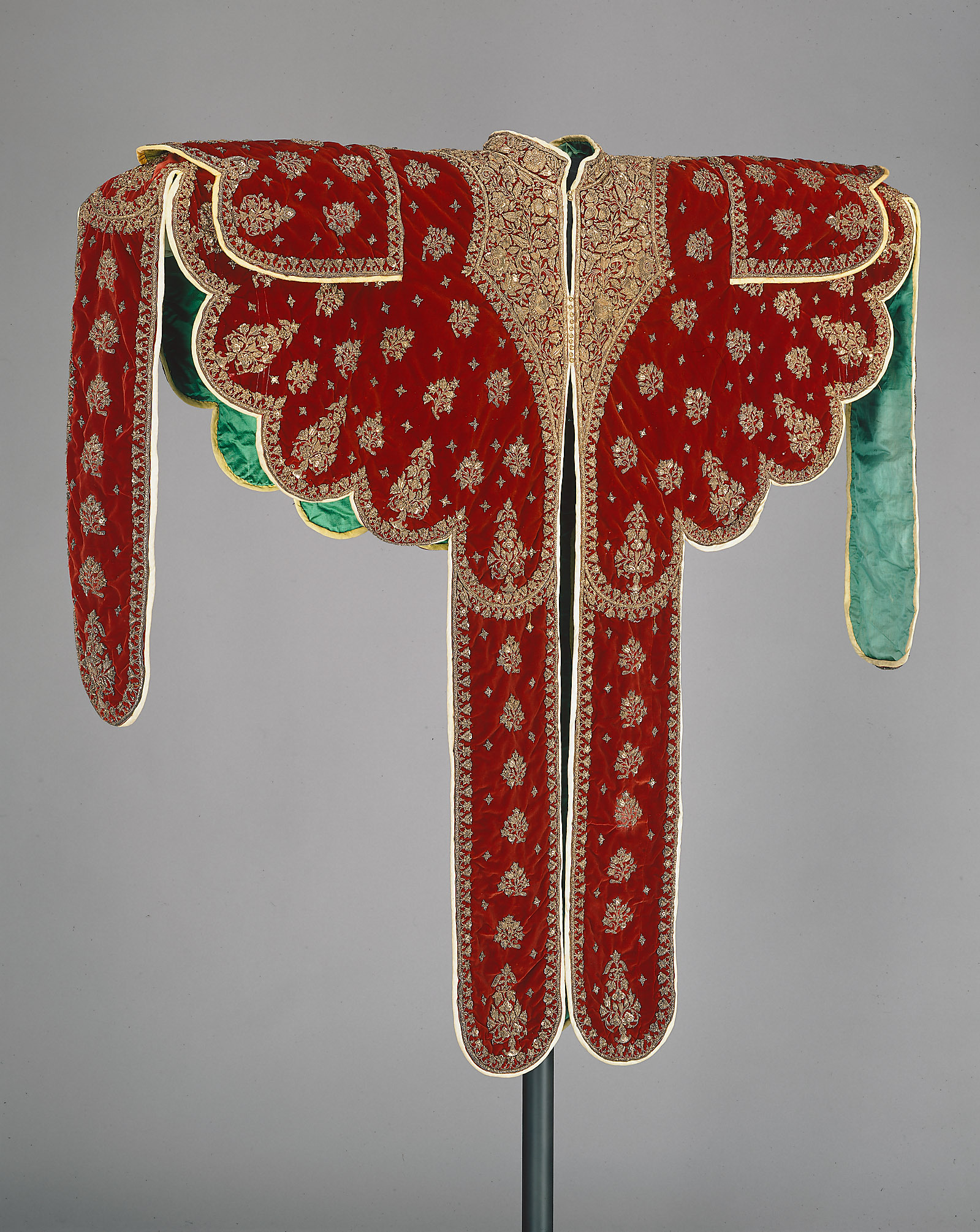 Silk, velvet with metal embroidery from metal fancy double threads and paillettes, gilded metal; satin from silk and cotton