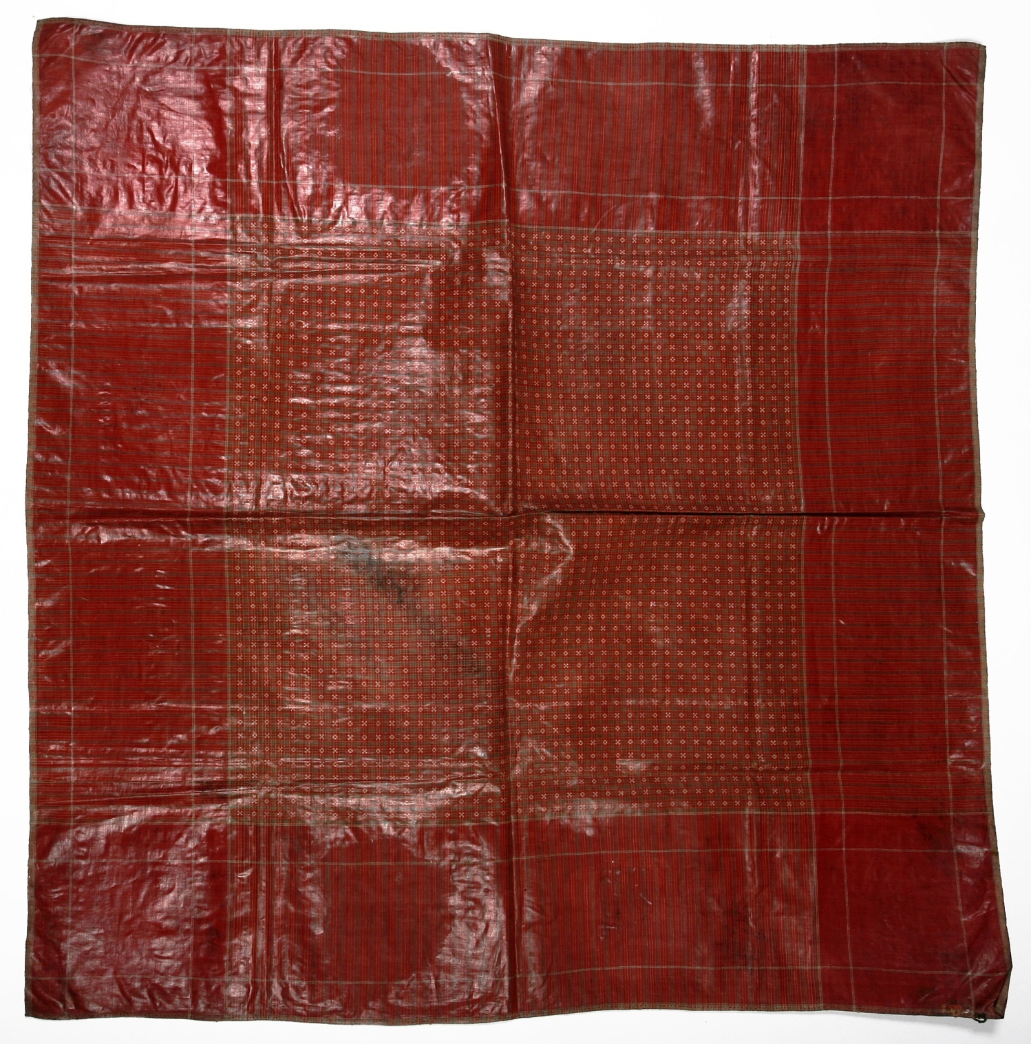 About one square meter of smooth cotton, one blue, the other red; The blue one has a hem of light-blue stripes, the red with a hem of white and green stripes. Both are very stiff and smooth like the two sarongs, above. It has already been mentioned that the head scarf belongs to the national dress of all the Muslim natives in the Indian archipelago. Some ethnic groups only use a head covering that never is taken off the head. It has also already been said that each of the ethnic groups, each tribe, binds the cloth in a different way around the head, and it is thus possible to identify both the ethnic group and the geographic area of the wearer. The Makassars and the Buginese wear it in the most picturesque manner, so that two ends are pulled out and up above the head making them look like wings. If the cloth is stiffened, then these pulled-out, wing-like points stand up, if un-stiffened, they sink to half size."