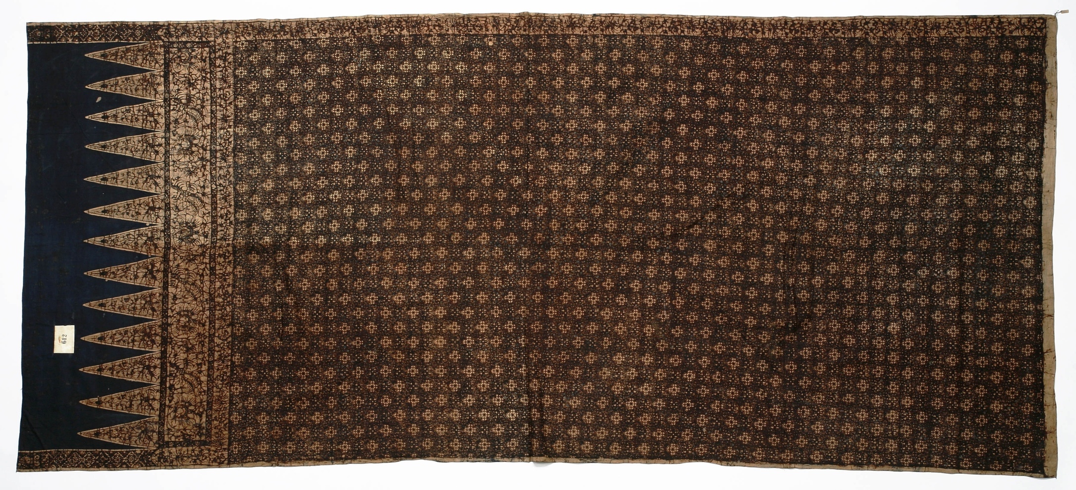 The Javanese sarongs are very narrow, have few folds when they are worn, layclose to the body. They are all dyed in the manner described above (batik) andexhibit more or less fine designs. They are popular house dresses for allEuropean women in India, who spend their whole lives, so to speak, in suchclothes. They sleep in them and wear them at home and even go out in them to dotheir shopping. Only in the evenings in large towns and places, where visitsare made and received, are European clothes worn. On the steam ships, in thehotels, everywhere one sees the women only in these clothes. It is a very cooland comfortable costume but also unattractive, since it covers the body like asack. Above the sarong the European women wear a long cotton jacket, more orless elegantly embroidered. Sarong and "kabaja" - that is the name ofthe jacket - are the only components of this house dress. The Javanese sarongsalso have a simple, large surface which has a uniform pattern, then the headpart, "kapala", which is quite different and unique in its design, ofhorizontal zigzag pattern which is variously colored and rich with flowers andarabesque decorations. These examples have very fine designs, two come fromSurukarta, blue, brown and yellow, the third from Surabaya - a very finelyexecuted two-color design in red and yellow."
