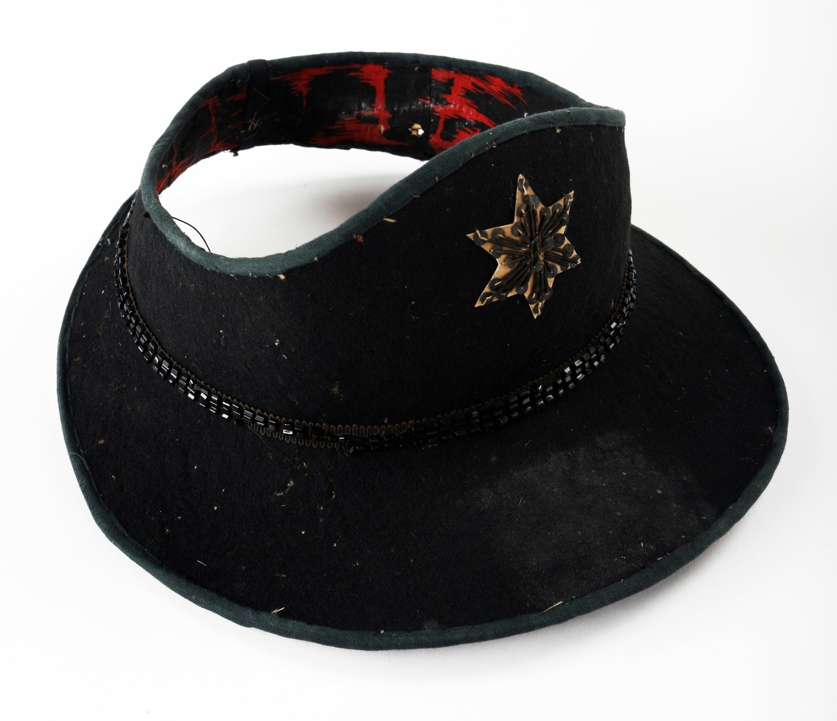Two real Javanese head coverings, original and national. The shape recalls a European eyeshade of a person who is suffering from an eye-sickness. The cap is only a large visor above the eyes which is attached to a ring that goes around the head. The cap has no covering at the top but only a part for the forehead which goes above the visor in a point to the crown. This cap, which leaves the crown open and only shades the eyes, only serves to protect the eyes from sunshine. The head itself is covered tightly in a blue head cloth, on top of which this peculiar head covering is set. These caps are made of stiff paper or leather, covered with black cloth; one of the present caps has a gold border, the other is decorated with black glass beads. Such a head-covering is worn in daily life in the street by every true Javanese, high and low. It is a typical head-covering that is only to be found among the Javanese. The peculiar shape of this cap that has no top is determined by the fact that the Javanese have long hair which is wound together at the back of the head and formed into a knot towards the crown on top of which a normal cap could not sit; for this reason the crown of the Javanese cap is left open."