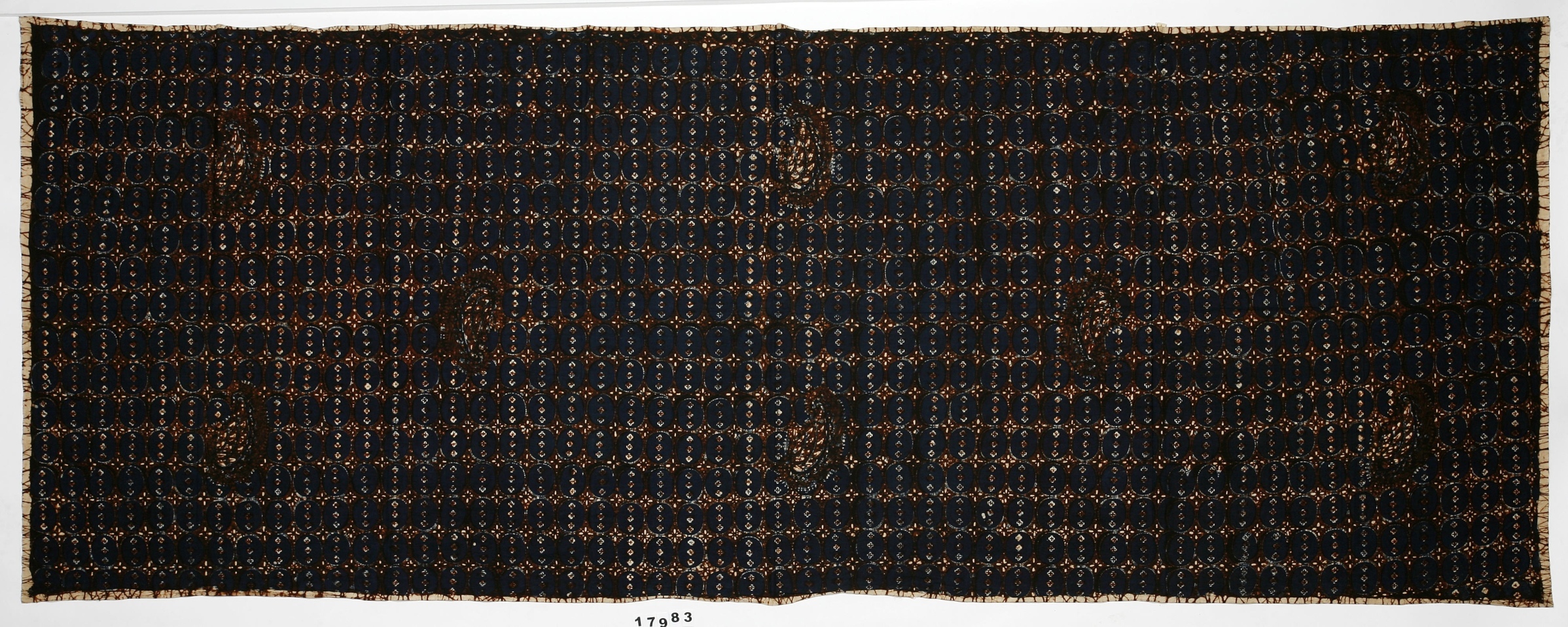 Cloths which are dyed in this way are worn in the entire Indian Archipelago by European women and for this reason the manufacture of these cloths is so extensive. They are imitated in Europe, in Switzerland and France in large factories and exported to Java en masse, where they are, however, mostly bought by European women and by natives who work in European households. These pieces of cloth are true Javanese works, from the independent kingdom Surukarta. They exhibit fine designs in dark colors, primarily blue and brown."
