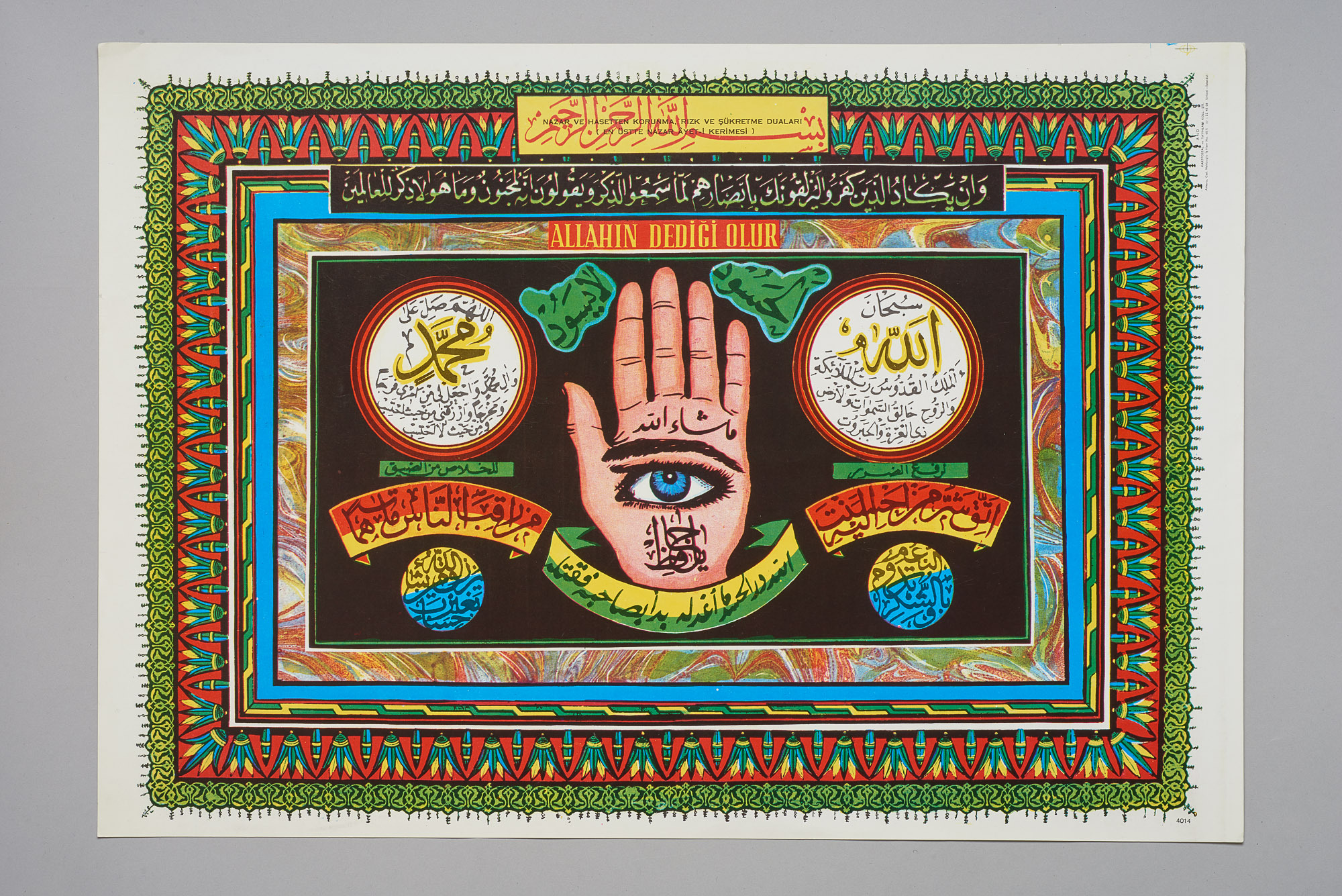 The protective hand and eye are inextricably associated with each other, in particular when it comes to defending against the evil eye, the envy of others. Material barricades, a symbolic eye or a repelling hand, should deflect destructive effects and secure the continued existence of one's own family. A Turkish house blessing of the palm of a hand with inscribed eye promises well-being and protection against the evil eye: "Allahın dediği olur"– "God's will be done."