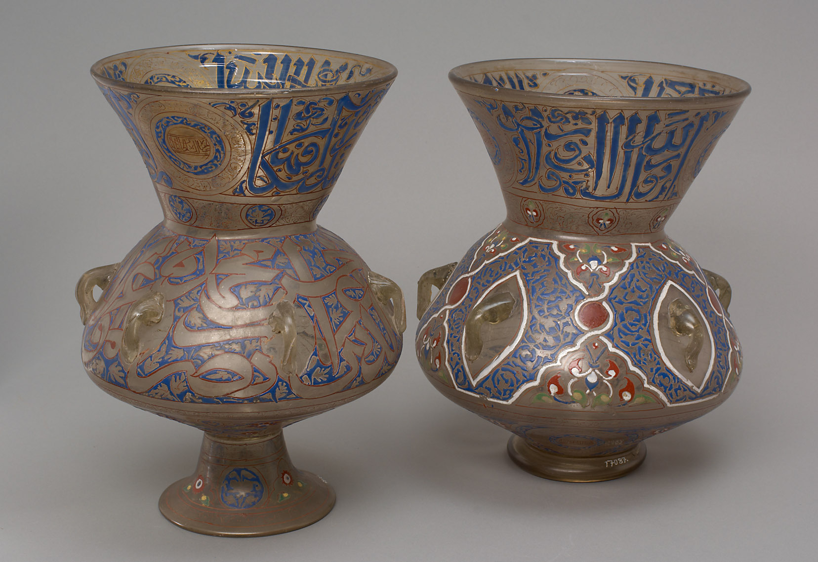From 1356 to 1363 Sultan an-Nasir al-Hasan commissions a mosque to be erected in Cairo. At the time it was deemed to be the largest in the world. He equips it most luxuriously with mosque lamps made of enamelled glass. The most magnificent mosque lamps are produced in the workshops of Aleppo and Damascus, and their reputation extends far beyond the Islamic lands into the Western world and as far as China. In the mosque, they are suspended on fine bronze chains from the ceiling, reminiscent of the star-spangled heavens. They decorate the space more than they illuminate it. In accordance with the religious surroundings, their ornamentation is modest: some elegant arabesques, the initial lines of the famous verses of light from the Koran, a dedication to the renowned benefactor. Together with his crest, the mosque lamps should announce his generosity and his wealth. Two of these precious mosque lamps were brought out of Egypt by Archduke Ferdinand Max, the future Emperor of Mexico, probably in 1855 when the fleet of the imperial and royal military navy visited there; he embellished one of the splendid halls of his pleasure palace near Trieste with them.