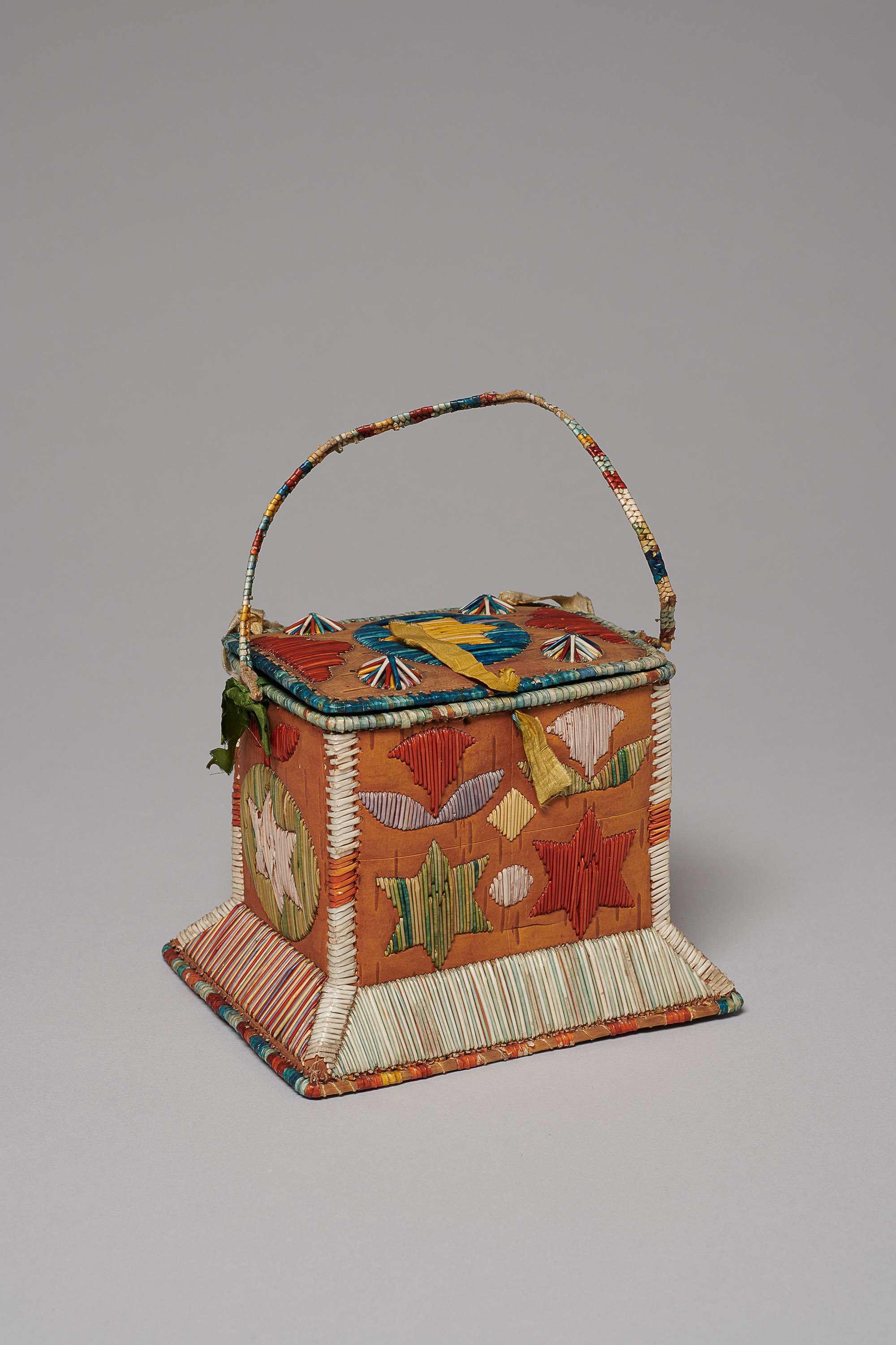 Birkenrinde, Stachelschweinborsten, Seidenbändchen, Holz, Leder, Papier, Farbe
