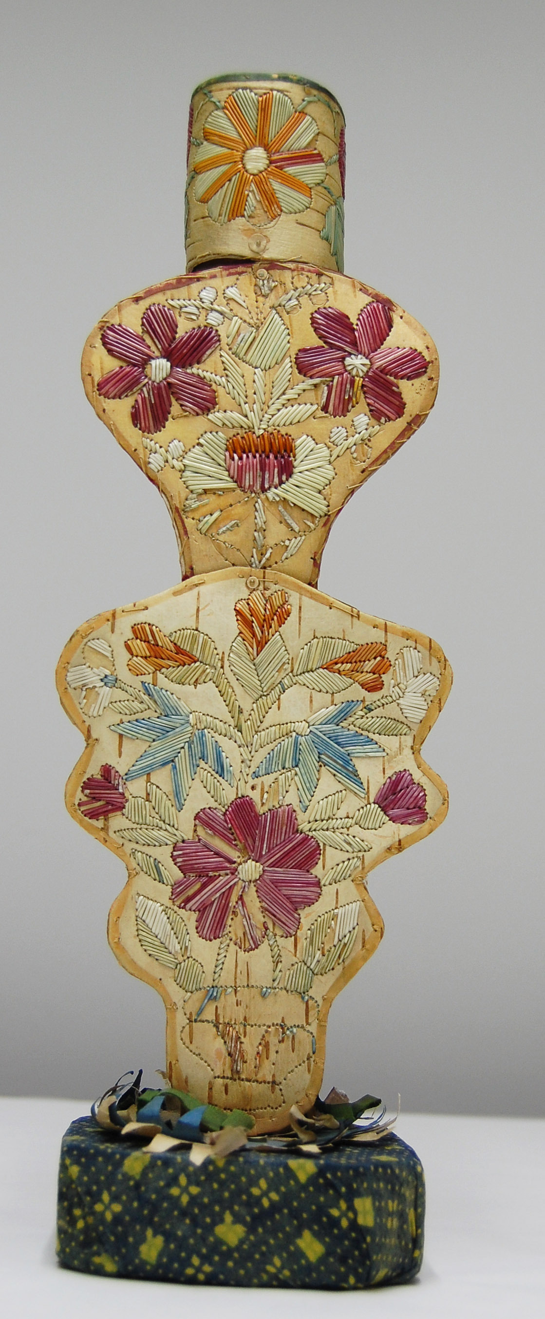 Wood, bark, dyed porcupine quills, silk, plant fibres
