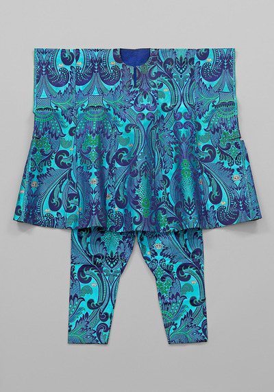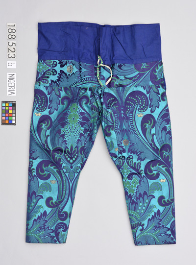The seemingly baroque design of this peacockblue men’s ensemble has a name, woven into a selvedge that has beenincorporated into the top (dansiki): ‘SUPERIOR QUALITY “AJA-LO-LERUATARI AJANAKU” SPECIALLY AND EXCLUSIVELY FOR OKUNOWU BROTHERS WEST AFRICA’ and‘DELICRON “EXTRA AL’ADE”’. We have not yet been able to match these details toa place of manufacture. In any case, it sounds impressive and expensive, as thegolden crowns emphasise – and that was probably the point.
