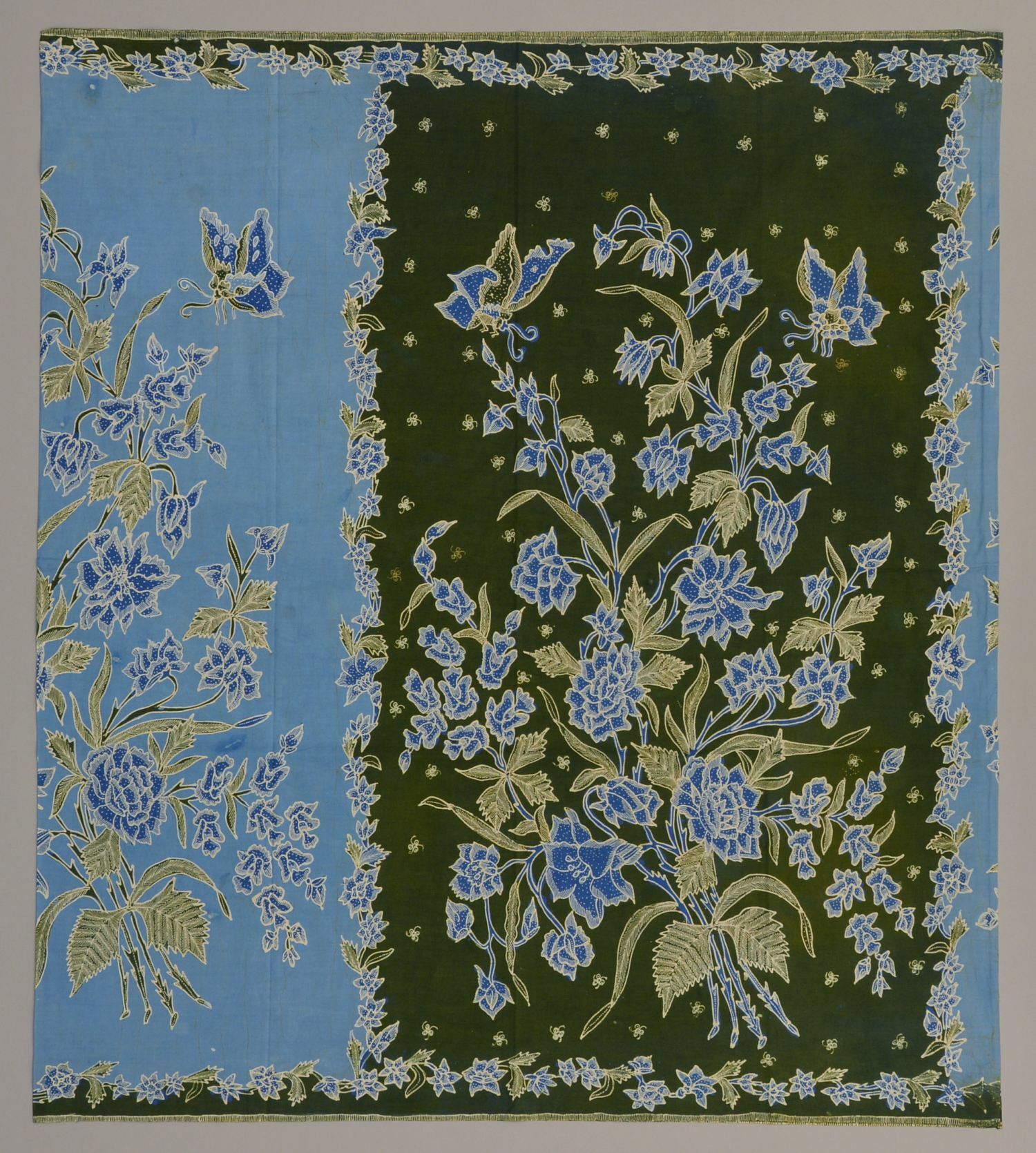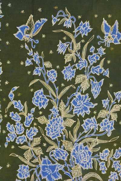 Ein Sarong Peranakan genannt Sarong Kelengan. Sarong Kelengan hat immer blauen Hintergrund.