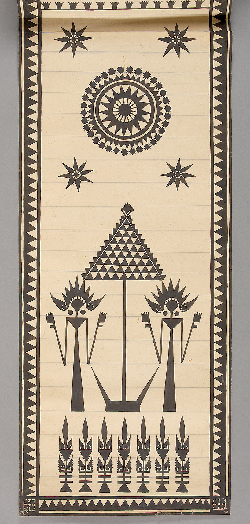 The small triangles of the frame of lamak are called gigin barong, 'the sharp teeth of a mythical animal'. The name of the geometric pattern is compang banggul, 'bamboo staircase'. Both cili seem to be protected by an umbrella, a sign of honour. This umbrella is in fact a gunung or mountain motif, balancing on top of a trunk like the crown of a tree or a flower on its stalk.