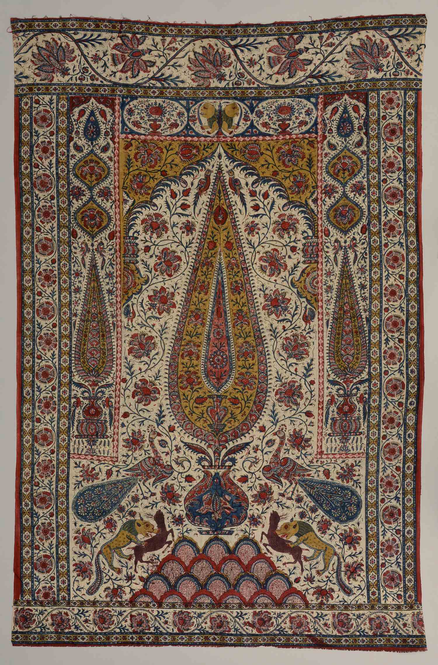 The Persian term qalamkar (literally, “pen-work“) refers to printed or painted cotton fabrics. These are decorated with depictions from Persian heroic fables, floral and tendril patterns or cypresses growing out of vases, and animals. Depending on the motif, qalamkars are employed as fabric for clothing, wall hangings, or table cloths. They belong to the most typical products of the Qajar dynastic period. The most famous member of this dynasty, Naser ad-Din Shah, visits the Vienna World’s Fair in 1873.