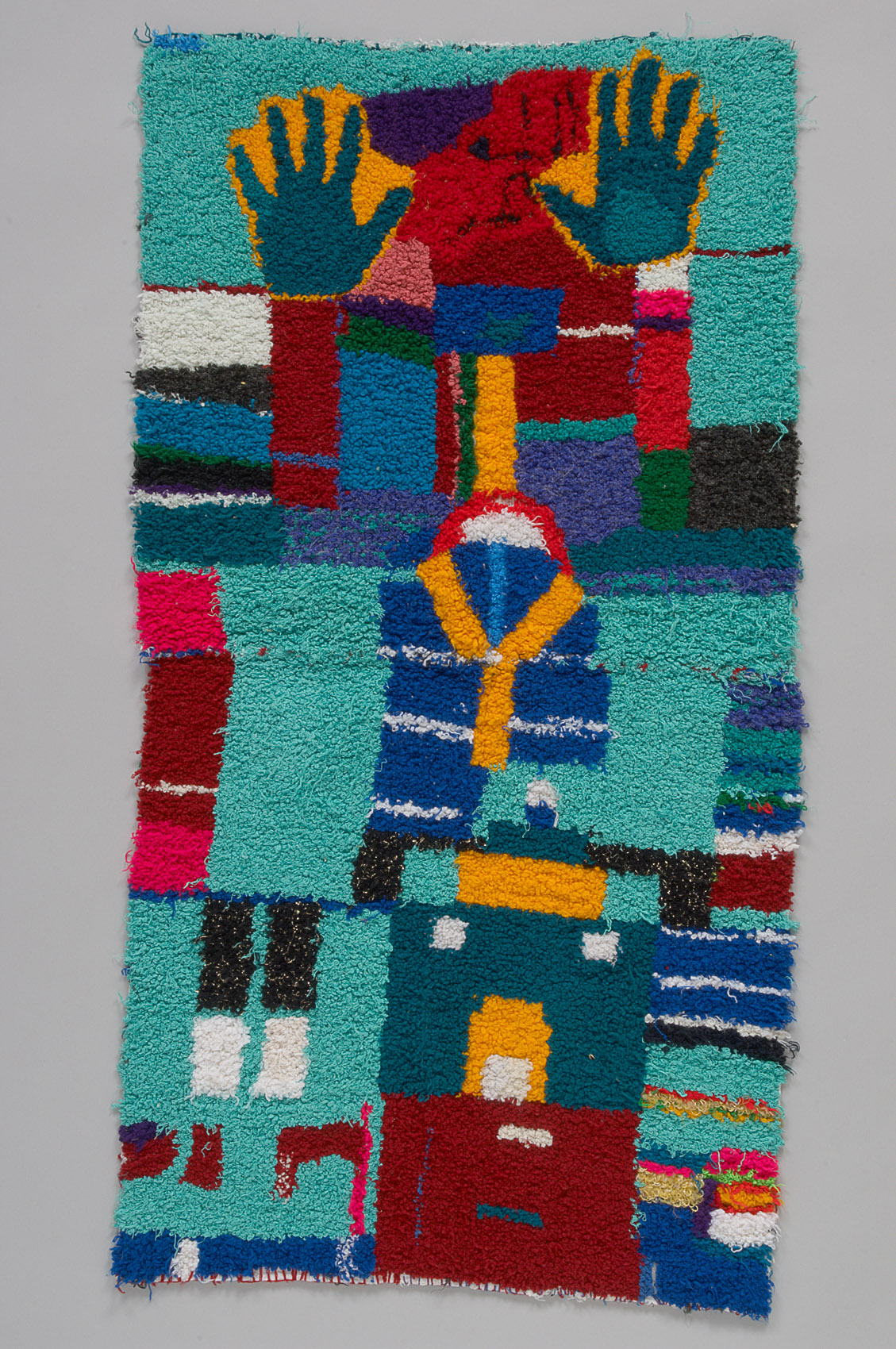 Auf einem marokkanischen Gebetsteppich gibt eine Gebetsnische die Gebetsrichtung nach Mekka an. Eine Moscheeampel verweist auf den Lichtvers im Koran: „Gott ist das Licht der Himmel und der Erde. Sein Licht [kommt] wie aus einer Nische, in der eine Lampe steht.“ (Sure 24, Vers 35) Zwei stilisierte Hände zeigen dem Betenden an, wo seine Hände zu liegen kommen sollen. Zuoberst steht die Anrufung Gottes: „Allahu akbar“– „Gott ist am größten“. Die offene Hand steht für die fünf Grundpflichten des Islam (Glaubensbekenntnis, Gebet, Almosen, Fasten, Pilgerfahrt). Zugleich soll sie negative Einflüsse abwehren und Glück und Fruchtbarkeit beschworen.