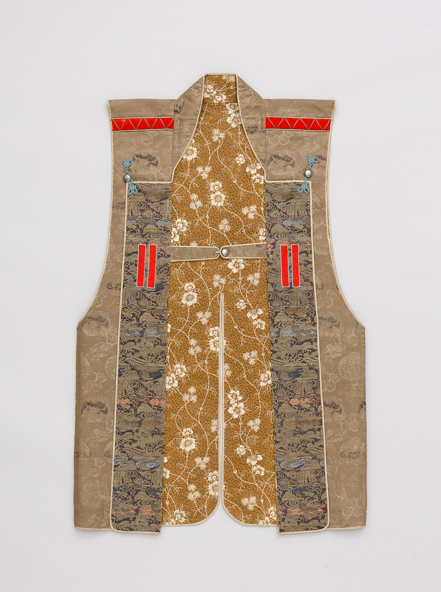 Der Waffenrock jimbaori wird über der Rüstung getragen bzw. zu Repräsentationszwecken. In der Edo-Periode war die Verwendung von importierten Stoffen wie chinesischen Seidenbrokaten oder süd- und südostasiatischen Baumwollbatiken sehr beliebt. Auf dem Rücken war das jeweilige Familienwappen des Lehnsfürsten angebracht, hier das sumitate yotsume Wappen („Über Eck gestellte vier Augen“).