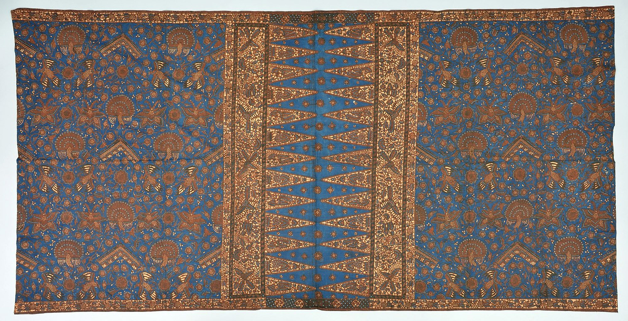 Ein sehr altes, gut erhaltenes und interessantes Batiktuch mit einem Semen-Muster. Das Semen-Muster zeigt die Darstellung von stilisierten Vogelflügeln, es kann sich um einen Flügel (lar) oder ein Flügelpaar (sawat) handeln. Es stellt die Flügel des Göttervogels Garuda aus der hindu-javanischen Mythologie und ein Reittier der Gottheit Vishnu dar. Semen-Motive verheißen Fruchtbarkeit, Spiritualität und Reichtum.