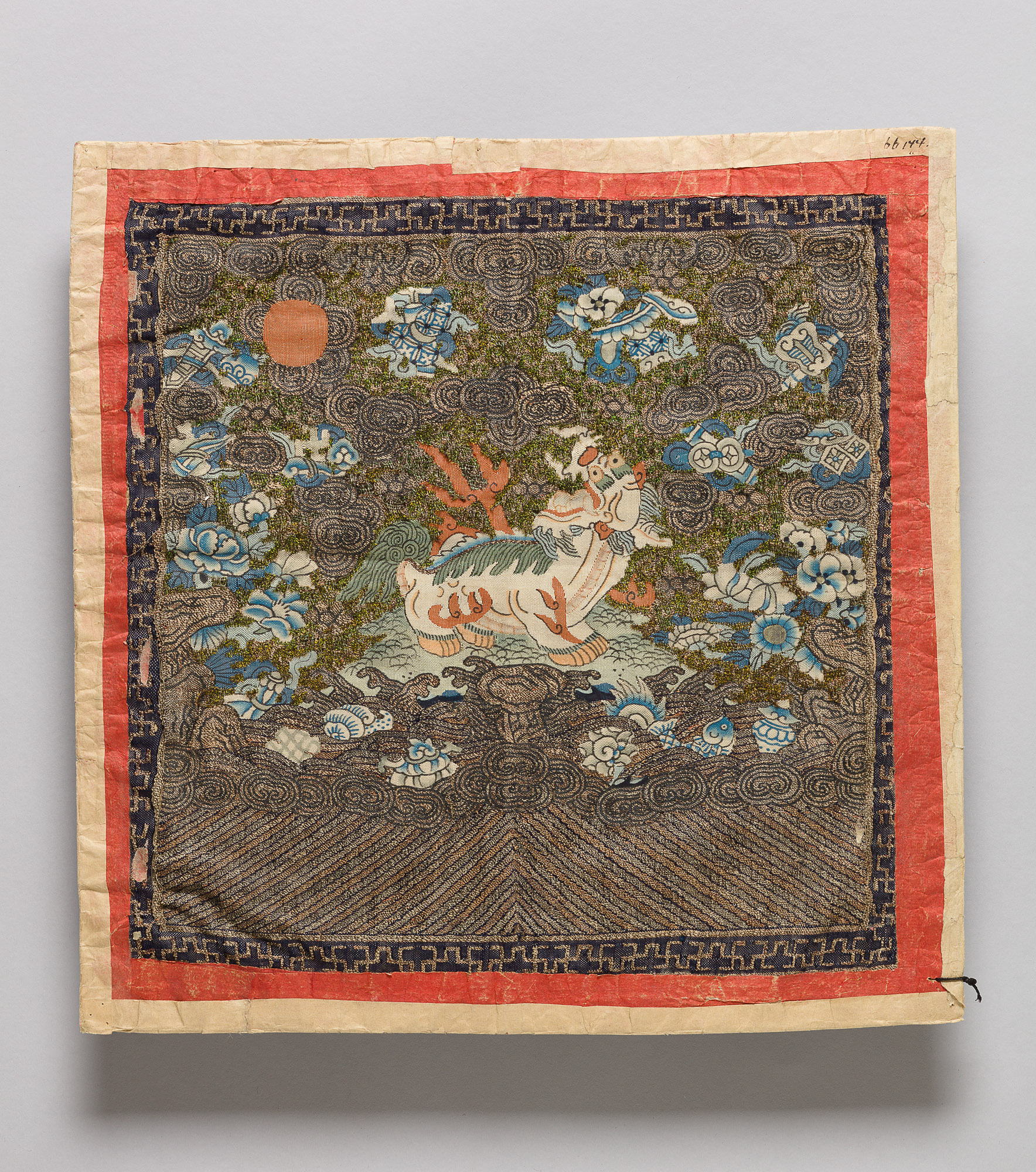 Seide, Papier, Metalllahn, Pfauenfedern; Bildwirkerei, teilweise bemalt