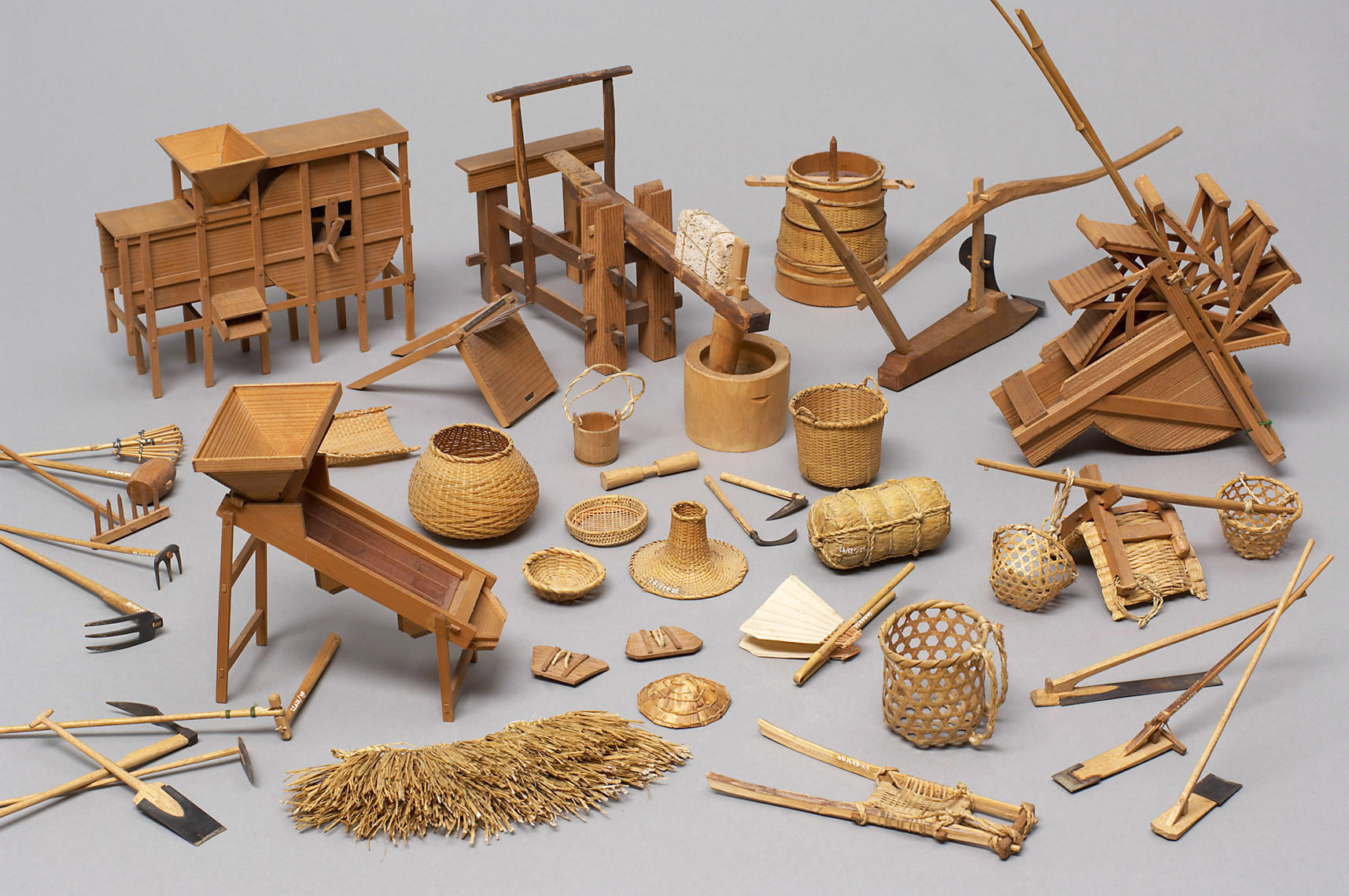 Detailgetreu nachgebildete Miniaturen von landwirtschaftlichem Werkzeug,das von der Bestellung der Felder bis zur Ernte benutzt wurde, sowie Utensiliendes bäuerlichen Alltaglebens. Angesichts der unterschiedlichen Formen derHacken dürften diese nicht aus einer einzigen Region stammen. Sie wurdenvermutlich als Miniaturen von Werkzeug aus unterschiedlichen Regionenangefertigt, unter Zuhilfenahme von Nachschlagewerken zur Landwirtschaft, wiebeispielsweise Nōgu benri ron von Ōkura Nagatsune (1822). Die Miniaturenzeigen die wichtigsten Utensilien für die Reiszucht und den Ackerbau, wieHacken und Spaten zum umgraben der Felder, Häufelpflüge für den Dammanbau, einpersonengetriebenes Tretrad für die Wasserregulierung der Reisfelder, große geta (Holzsandalen) die im Nassfeldgetragen wurden, ein, Dreschflegel, Mörser oder senbakoki („Tausend-Zahn-Dresche“) zumDreschen von Reis und Getreide sowie Worfschaufeln zum Trennen der Spreu vonReis oder Getreide. Hinzu kommen Transportgeräte, wie Tragekörbe oder Tragebretter,und Kleidungsstücke, wie Strohröcke, -hüte und -sandalen. MM
