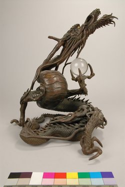 体をうねりながら上を向いて大きく口を開き、舌を出しながら吠えるかのような龍。力強く長い爪で水晶の球体を左前足に持ち、他の足は地面をつかむかのように爪を立てている。首から尾まで背中に鋭いトゲが連なり、体は鱗文でおおわれ、角とひげが後ろに長くたなびく。蛇のような腹板(腹鱗)の底の部分における二つの鋳銘「行年六十九歳」「渡雲齋鋳」により、作家の晩年の円熟した時の作品とわかる。xxx木村渡雲は江戸時代後期の岩手県出身の鋳金家で、初代村田整珉の養子となった。文政12年(1829)に二代整珉と名乗って活動したが、天保はじめ頃(1830年代)に初代整珉の実子が三代整珉となったのちは、木村渡雲の名前に復帰した。水晶玉を持つ龍の置物は好運をもたらすとして人気が高いモチーフであるが、木村渡雲はとりわけ優れた龍の造形で名高く、本作に見る精密な表現と迫力により、その評判は証明されているといえよう。