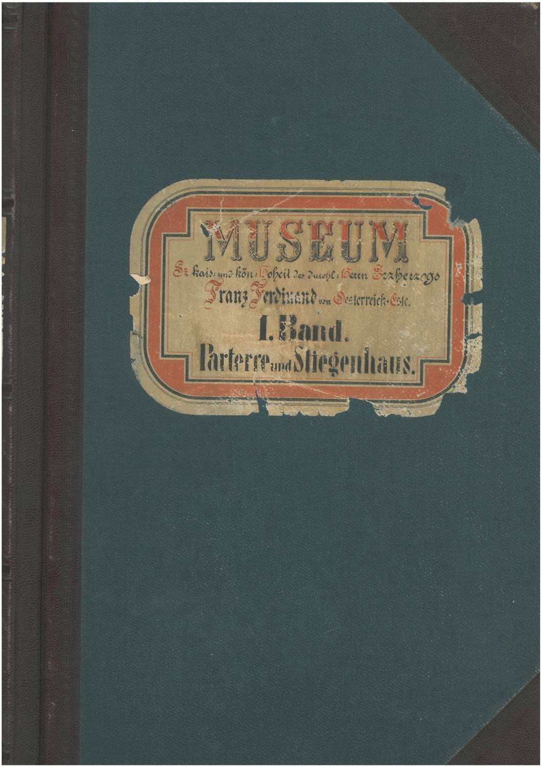 1. Band des dreibändigen handschriftlichen Inventars der im »Museum Sr. kais. und kön. Hoheit des durchl. Herrn Erzherzogs Franz Ferdinand von Oesterreich-Este« in der Beatrixgasse 25 aufgestellten Sammlungen: »Parterre und Stiegenhaus«.