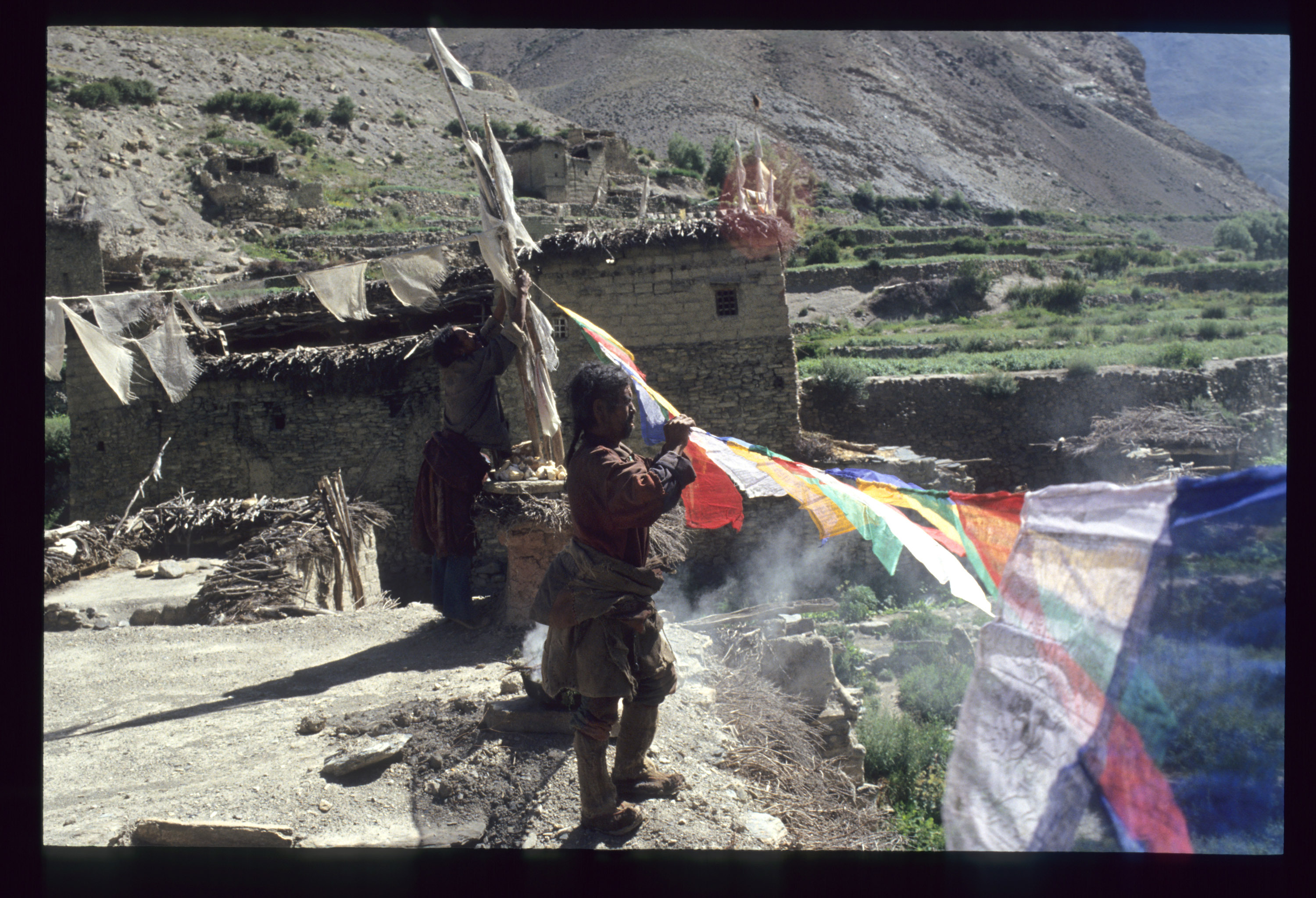 Neue Gebetsfahnen werden auf einem Hausdach angebracht.