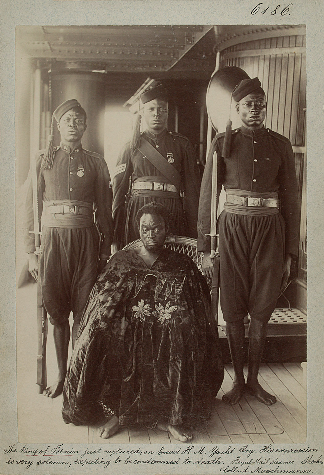 Originalbeschriftung auf Photographie von Captain Maschmann (?): „Der König von Benin, gerade gefangen