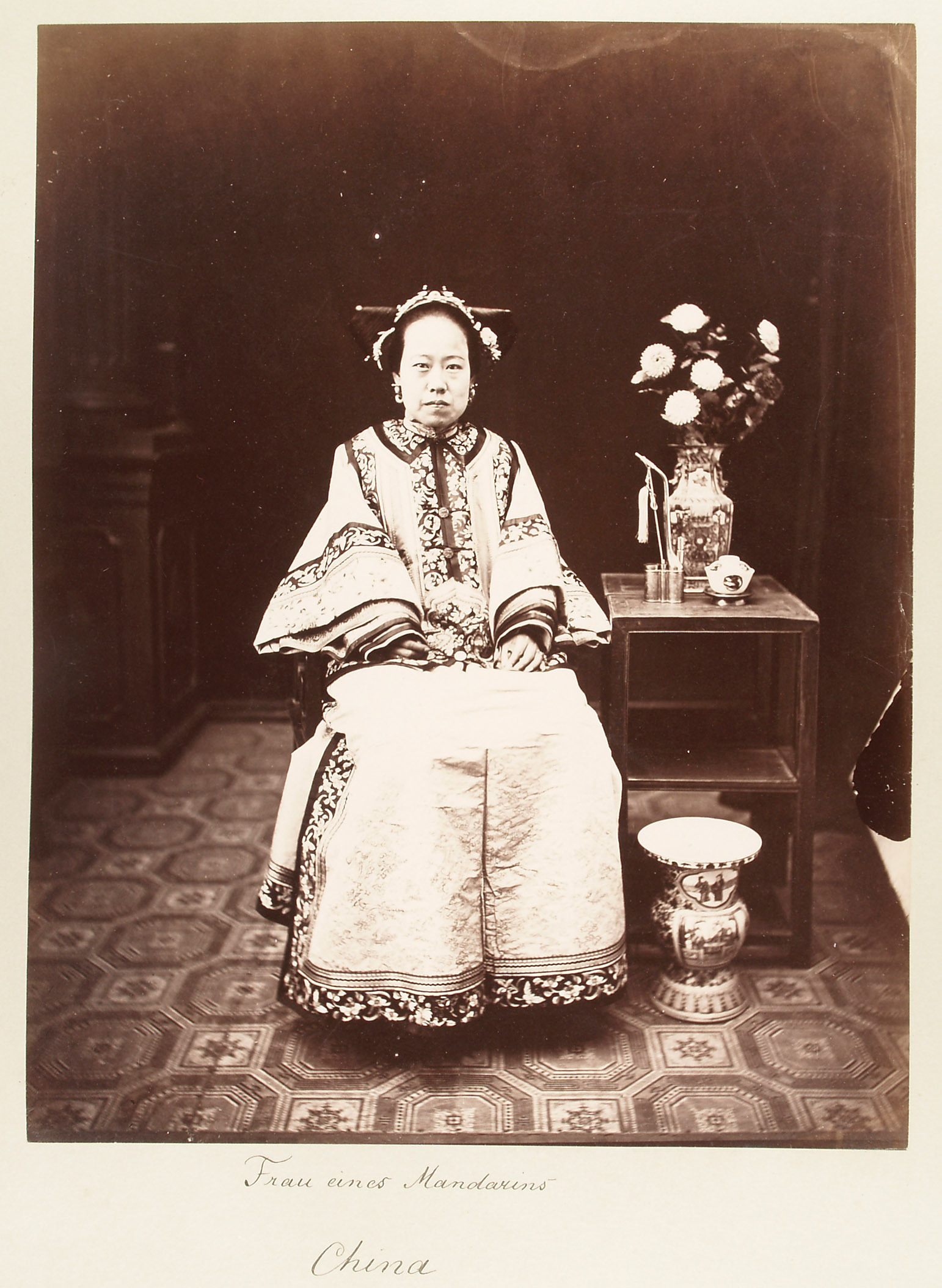 Dieses Photo ist vermutlich eine Studioaufnahme und zeigt eine Chinesin bei Tee und Wasserpfeife.