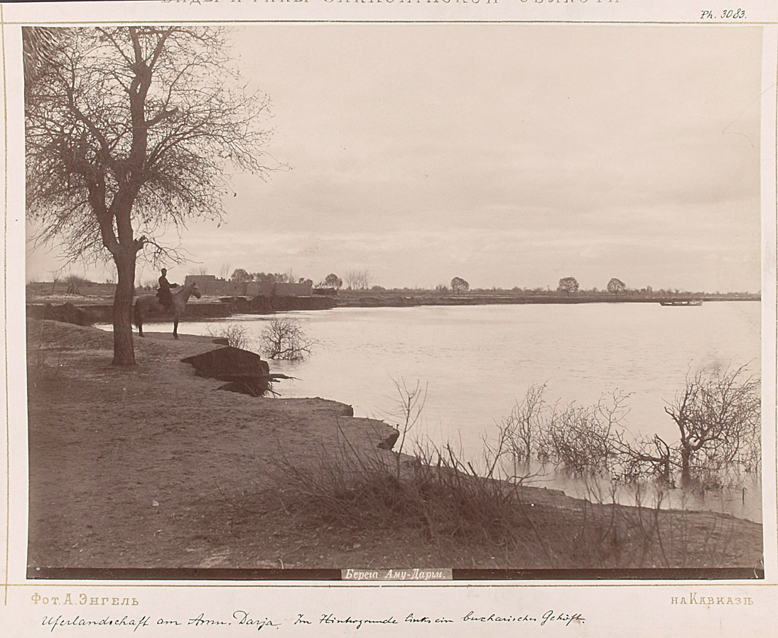 Uferlandschaft am Amu-Darja. Im Hintergrunde links ein bucharisches Gehöft