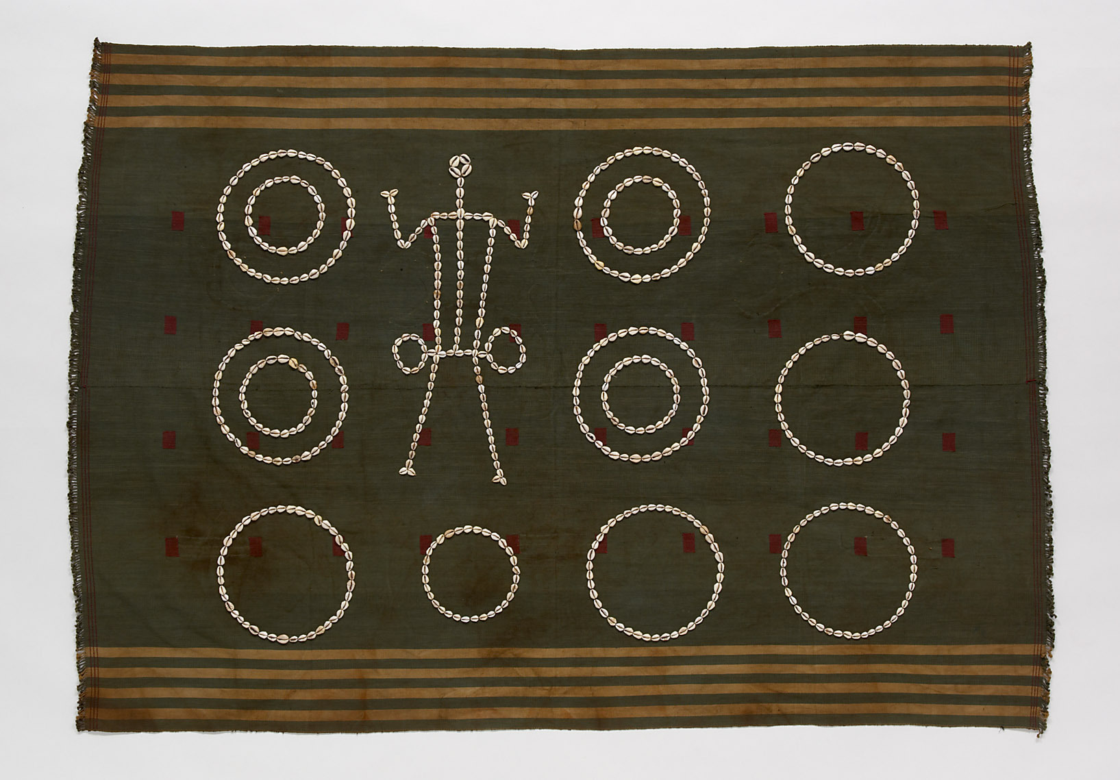 Körpertücher mit aus Kaurischnecken aufgestickten Mustern wurden von Männern der Khiamniungan-, Sema-, Sangtam- und Chang-Naga getragen. Die abstrahierte Figur stellte einen getöteten Feind dar, während die Kreise je nach Stamm auf erbeutete Köpfe oder niedergebrannte Dörfer bzw. Dorfteile hinwiesen. Heute ist ein solches Körpertuch angesehenen Mitgliedern von Kulturvereinen vorbehalten, die es bei traditionellen Festen tragen.
