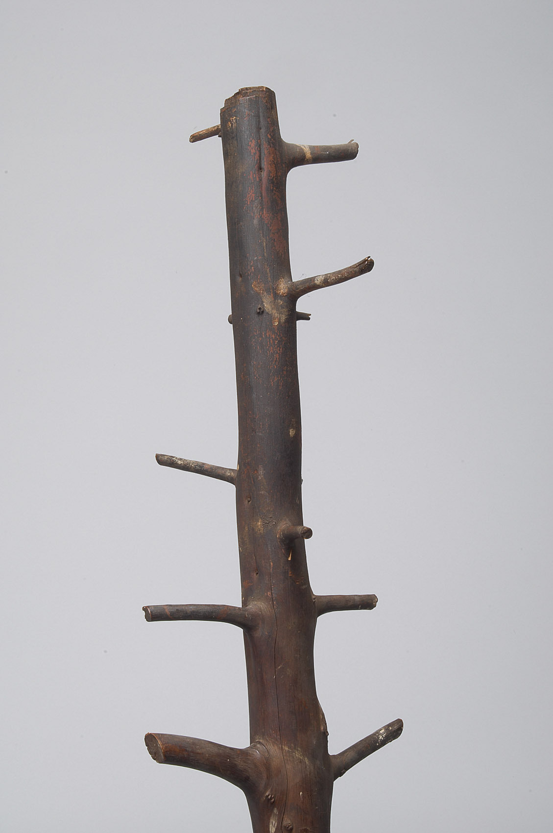 An kleinen Baumstämmen mit abgehackten Ästen wird auf Hochalmen im Himalaya vor dem Zelt oder der Hütte allerlei aufgehängt und so griffbereit gehalten.