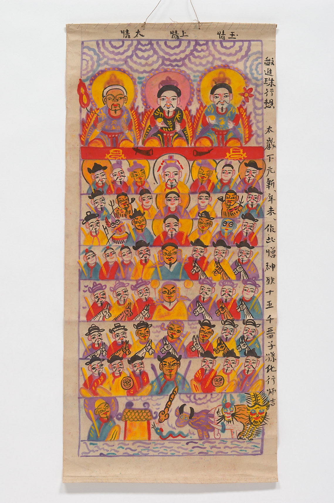 Das Set aus drei Bildern - siehe auch Inventarnummern 180077 und 180079 - wird auch „Kleiner Altar“ genannt. Tong Dan in der Mitte gilt als Versammlung vieler taoistischer Gottheiten vom Jadekaiser an der Spitze über Gottheiten die unter ihm dargestellt sind wie die Drei Reinen, die Marschälle, die Meister des Himmels und der Erde bis hinunter zu den vielen Wächtergottheiten. Diese Gruppendarstellung wird als Abbild der Ahnen bezeichnet, wobei sich Ahnen auf den Taoismus als solchem bezieht. Im Kern der taoistischen Philosophie sind alle diese Götter letztendlich nur ein bloßer Hauch, um das Tao erkennbar zu machen.
