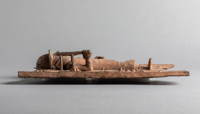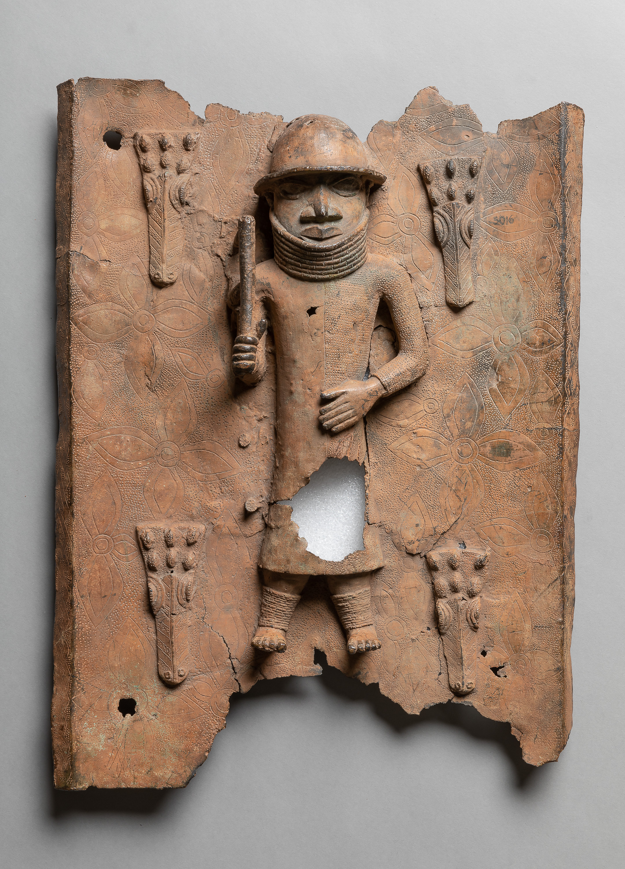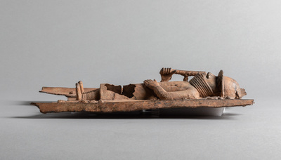 Diese Reliefplatte: Würdenträger mit vier Krokodilsköpfen ist Teil der historischen Sammlungen aus dem Königreich Benin im heutigen Nigeria. 1897 wurde das Königreich erobert und dessen Oba (König) Ovonramwen ins Exil verbannt. Die aus dem Königspalast geraubten Kunstschätze wurden anschließend über den Kunstmarkt verkauft, um die Eroberung rückwirkend zu finanzieren. Viele dieser Objekte sind heute Teil europäischer Sammlungen. Dieses Reliefplatte: Würdenträger mit vier Krokodilsköpfen konnte auf Basis seiner Provenienzkette in direkten Zusammenhang mit dem Überfall auf das Königreich Benin 1897 gebracht werden.
