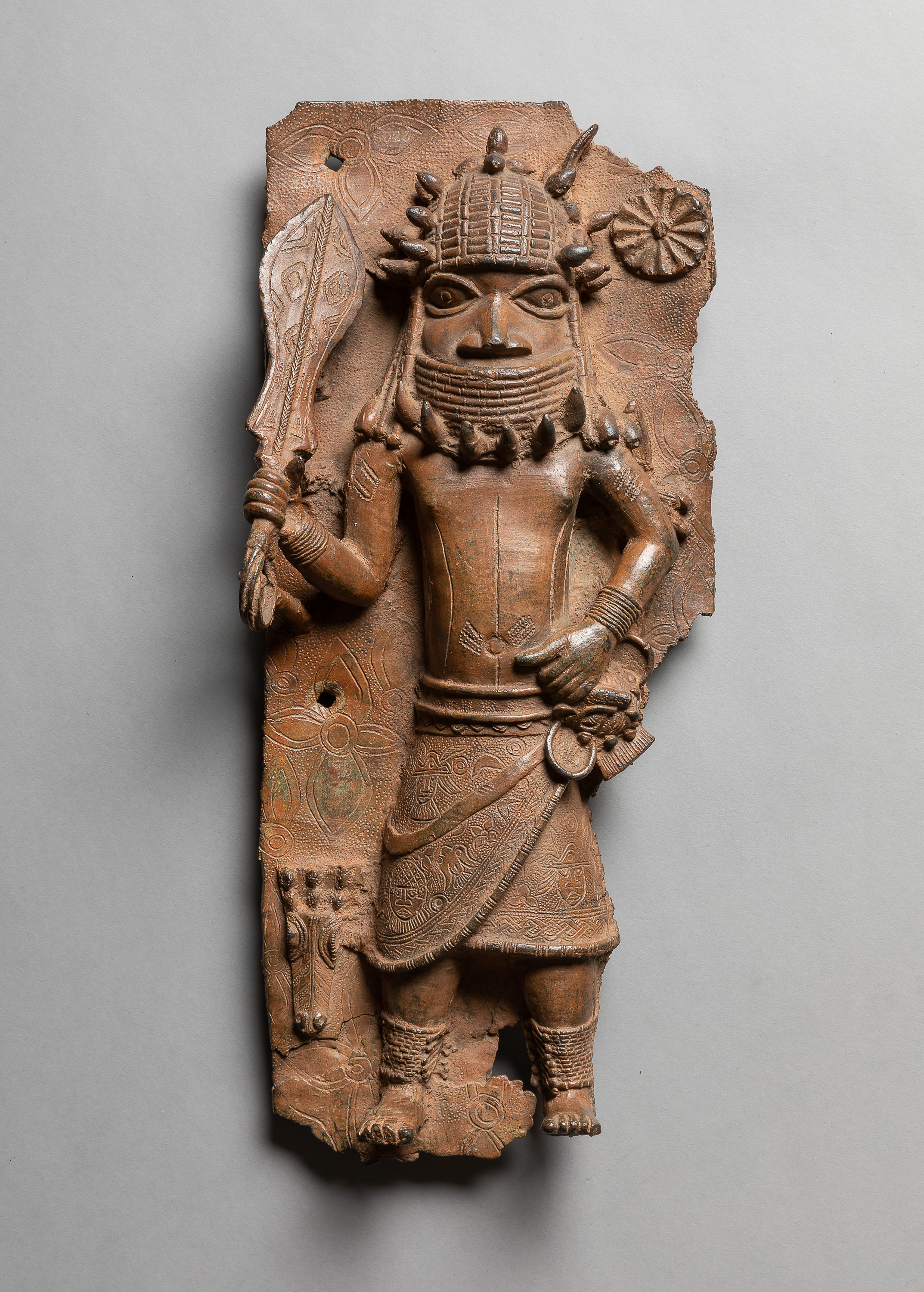Diese Reliefplatte: Würdenträger mit Eben-Schwert ist Teil der historischen Sammlungen aus dem Königreich Benin im heutigen Nigeria. 1897 wurde das Königreich erobert und dessen Oba (König) Ovonramwen ins Exil verbannt. Die aus dem Königspalast geraubten Kunstschätze wurden anschließend über den Kunstmarkt verkauft, um die Eroberung rückwirkend zu finanzieren. Viele dieser Objekte sind heute Teil europäischer Sammlungen. Dieses Reliefplatte: Würdenträger mit Eben-Schwert konnte auf Basis seiner Provenienzkette in direkten Zusammenhang mit dem Überfall auf das Königreich Benin 1897 gebracht werden.
