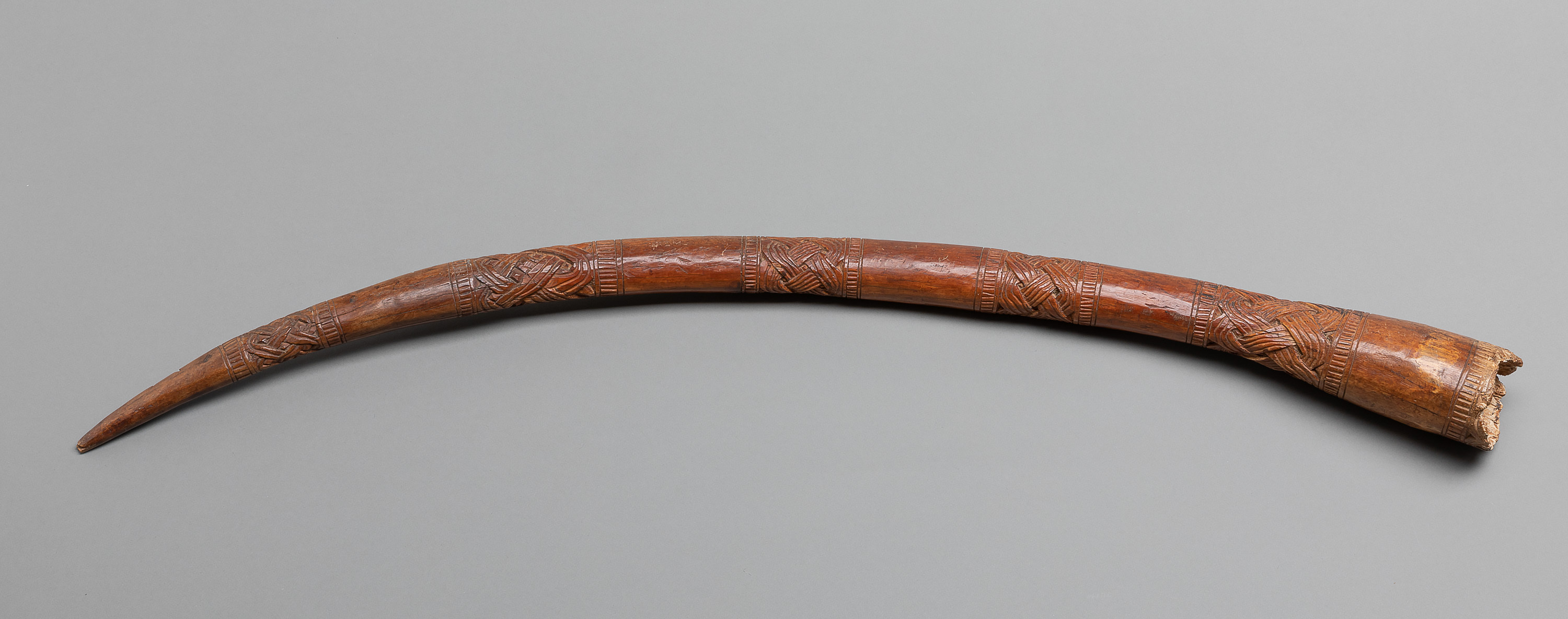 Dieser Elfenbeinzahn mit Königsmarke ist Teil der historischen Sammlungen aus dem Königreich Benin im heutigen Nigeria. 1897 wurde das Königreich erobert und dessen Oba (König) Ovonramwen ins Exil verbannt. Die aus dem Königspalast geraubten Kunstschätze wurden anschließend über den Kunstmarkt verkauft, um die Eroberung rückwirkend zu finanzieren. Viele dieser Objekte sind heute Teil europäischer Sammlungen.