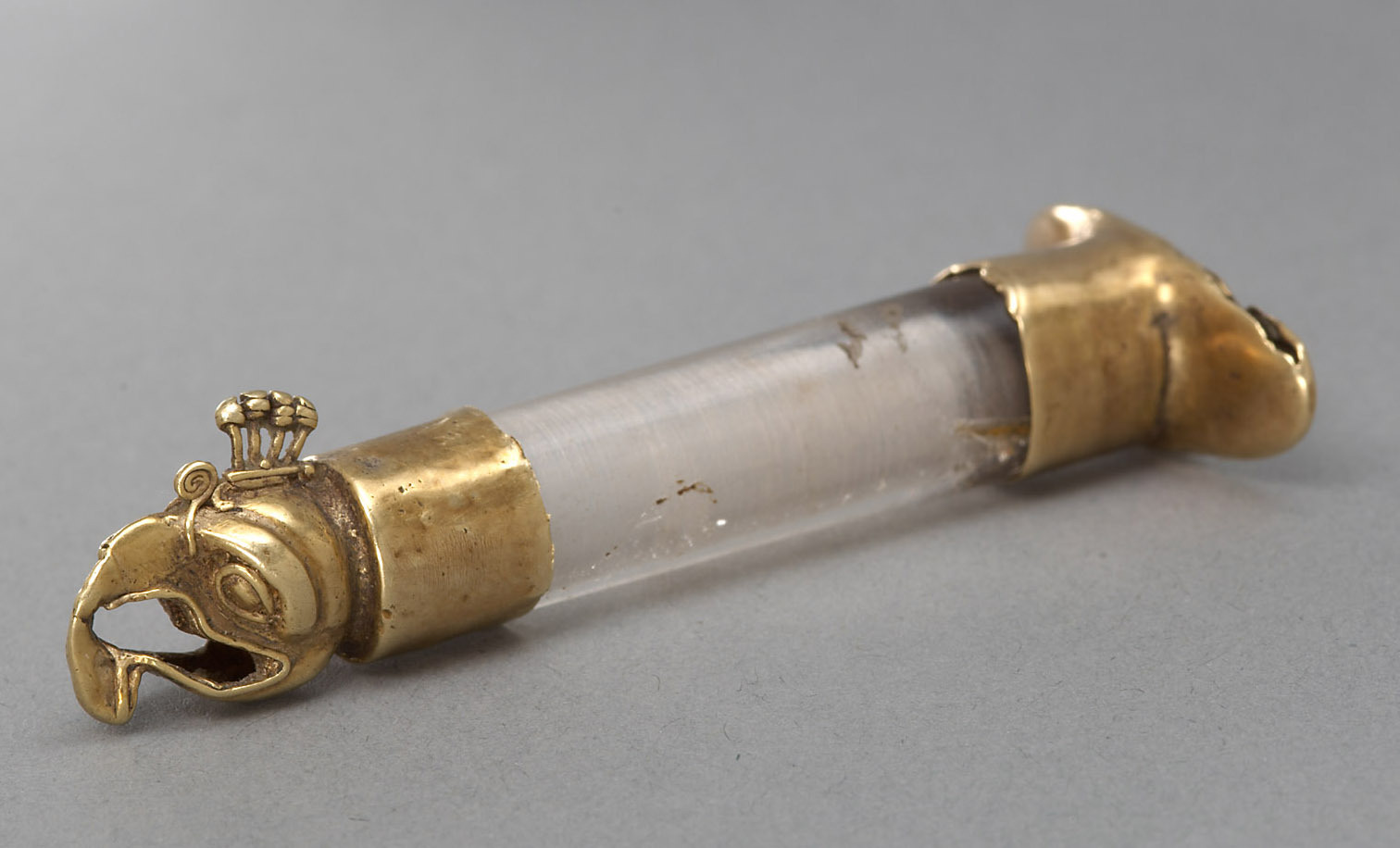 Das ist ein Lippenpflock. Lippenpflöcke gehörten im vorspanischen Mexiko zum Gesichtsschmuck des Mannes, wobei Form und Material den sozialen Status des Trägers widerspiegelten. Dieses Stück aus Bergkristall und Gold gehörte zu den Insignien eines Adeligen.Um den Lippenpflock einzusetzen, durchbohrte man die Unterlippe. Das verbreiterte Ende lag am Zahnfleisch auf und verhinderte, daß der Pflock herausfiel. Der vordere goldene Aufsatz ist als Vogelkopf gestaltet. Der scharf gekrümmte Schnabel, der vierstengelige Haarkamm und die davor angebrachte Spirale lassen vermuten, daß es sich um einen Adler oder Geier handelt. Dieses Stück stammt aus der mixtekisch-aztekischen Kultur und entstand im 15. oder frühen 16. Jahrhundert, also in der Zeit, die man als späte Nachklassik bezeichnet.
