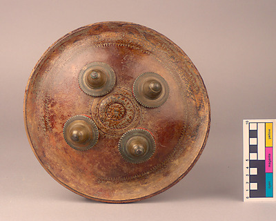 Aus Rhinozeroshaut gefertigrer Rundschild mit Goldlackdekor und Messingbuckeln . Griff aus Leder. Import aus Indien oder Maskat (Belutschen). Derartige Schilde wurden bei Fehden vor allem zum Schurz des Kopfes vor den Geschoßen der Steinschleuder eingesetzt. Mir der Verbreitung der Feuerwaffen kamen sie außer Gebrauch. Schilde wurden prinzipiell auf persönliche Bestellung durch Handwerker gefertigt oder von außen eingerauscht. Das in Muqallâ erworbene indische, vermutlich von in Maskat ansässigen Belutschen stammende Schild dokumentiert die damalige Bedeutung Muqallâs als Umschlagplatz des internationalen Fernhandels über den Indischen Ozean.