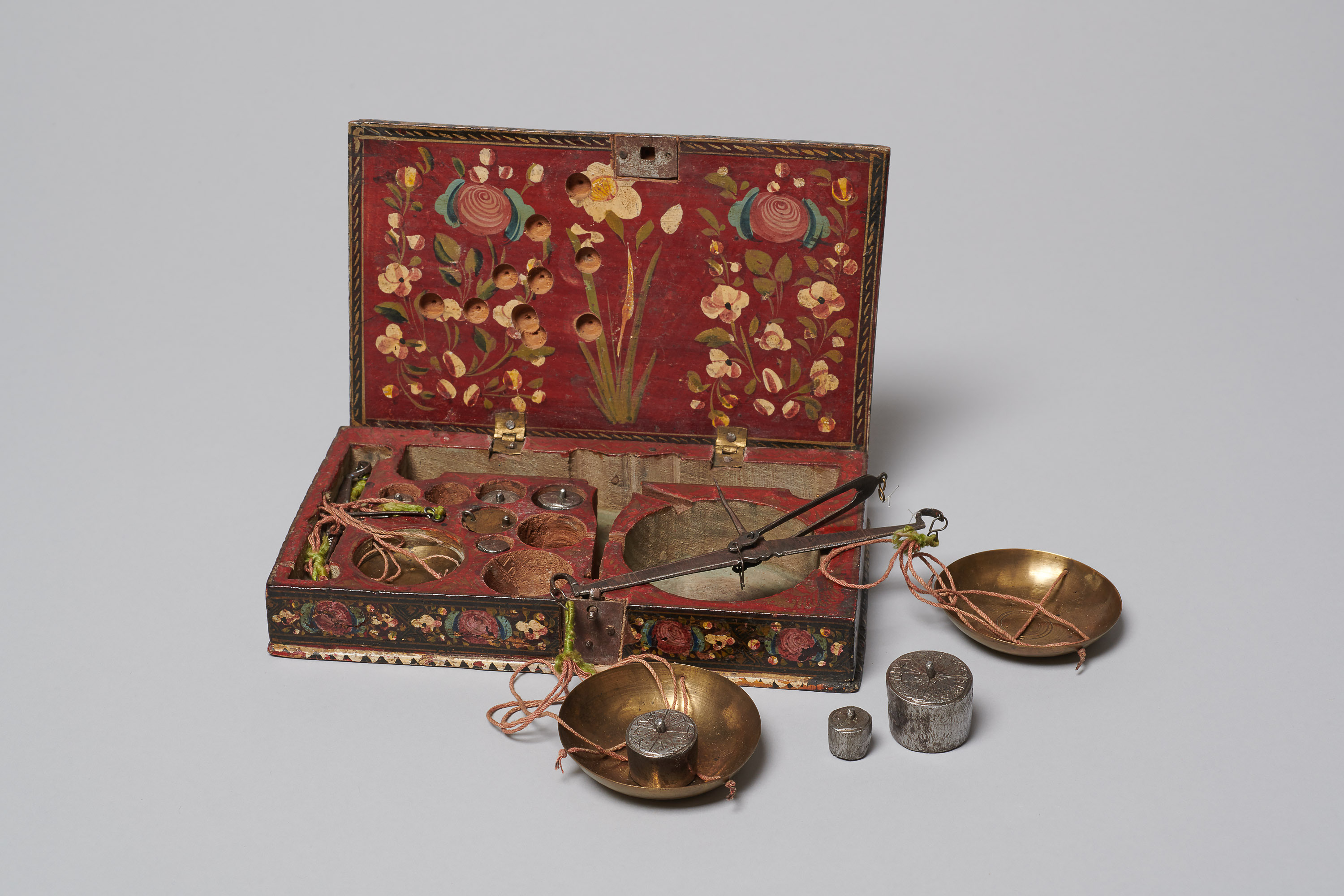 Bemalte und lackierte Schatulle (pers. qōtī, قوتی und قوطی bzw. jaʿbeh, جعبه) mit einer kleinen Balken- bzw. Schalenwaage (pers. tarāzū-ye mesqālī, ترازو مثقالی) und einem Satz Gewichtsstücke (pers. sang-e wazn, سنگ وزن). Derartige Waagen wurden von Goldschmieden, Apothekern, Parfumhändlern oder Personen, die mit Gütern handelten, die in kleinen Mengen zu relativ hohen Preisen verkauft wurden, verwendet. Laut Inventar stammt das Objekt aus Buchara, wurde aber höchstwahrscheinlich um die Mitte des 19. Jahrhunderts zur Zeit der Qajaren-Dynastie (1796-1924) in Iran hergestellt.