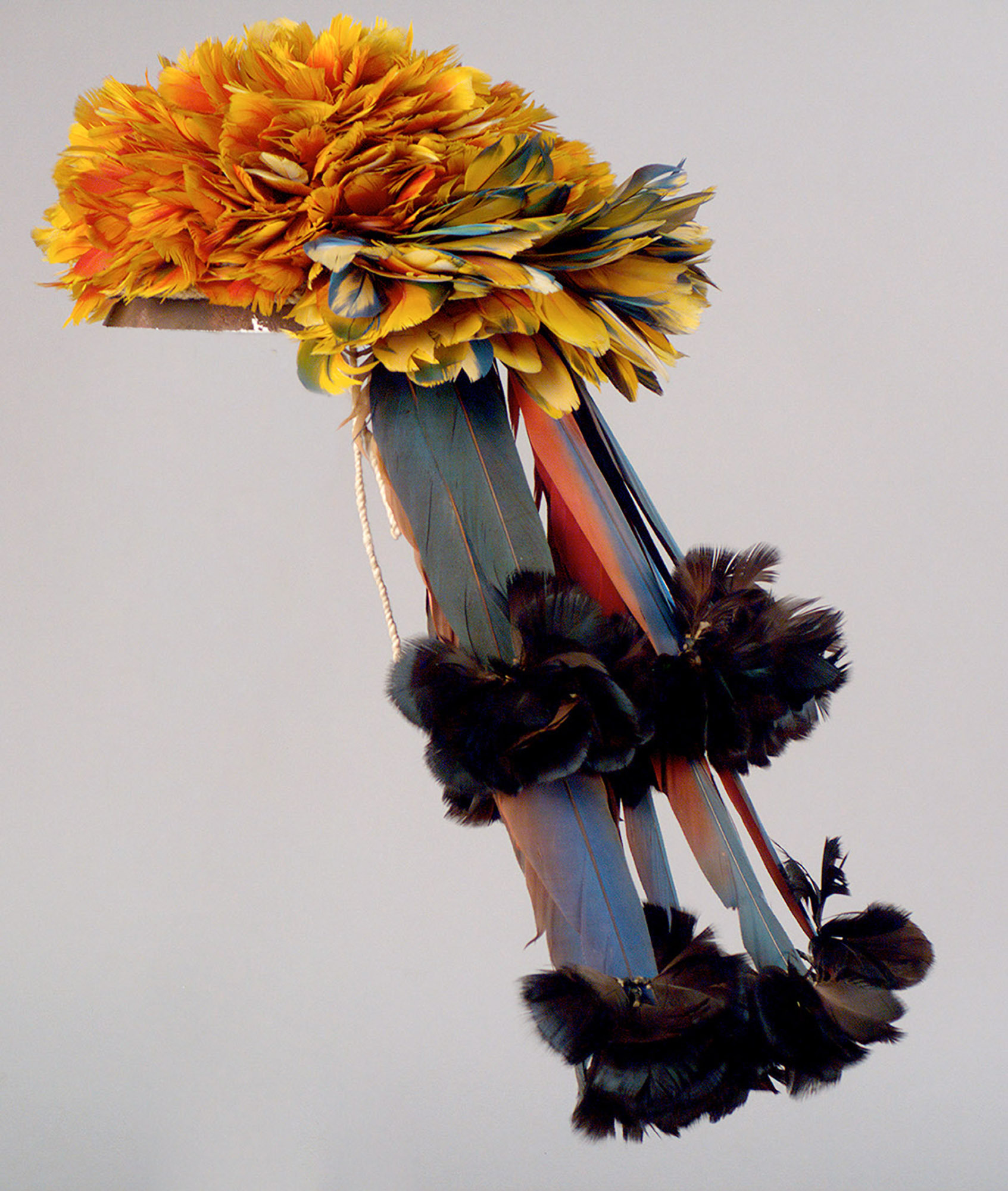 Schwanzfedern des Hellroten Aras, Körper- und Oberflügelfedern des Gelbbrustaras, schwarze Hokkohuhnfedern, Baumwolle