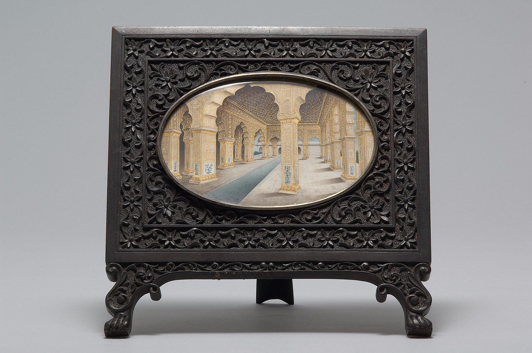 Die Miniaturmalerei auf Elfenbein zeigt den Diwan-i-Khas genannten Raum, in dem der Mogulherrscher Akbar im Roten Fort in Delhi hohe Beamte, Adelige und Gäste empfing. Heute ist dieser Raum eine Touristenattraktion höchsten Ranges.