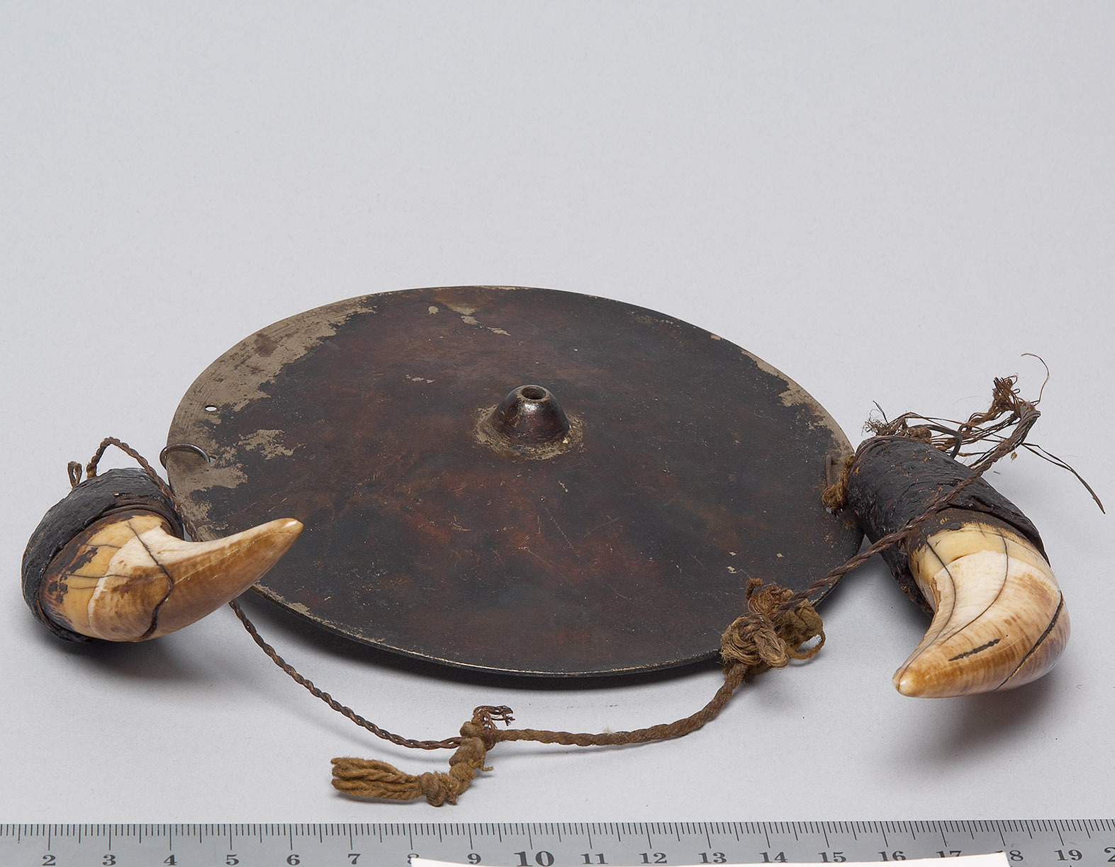 Die Messingscheibe war in den alten Zeiten als Währung in Gebrauch, durch die beiden Tigerzähne wird der symbolische Wert des Brustschmucks gesteigert.