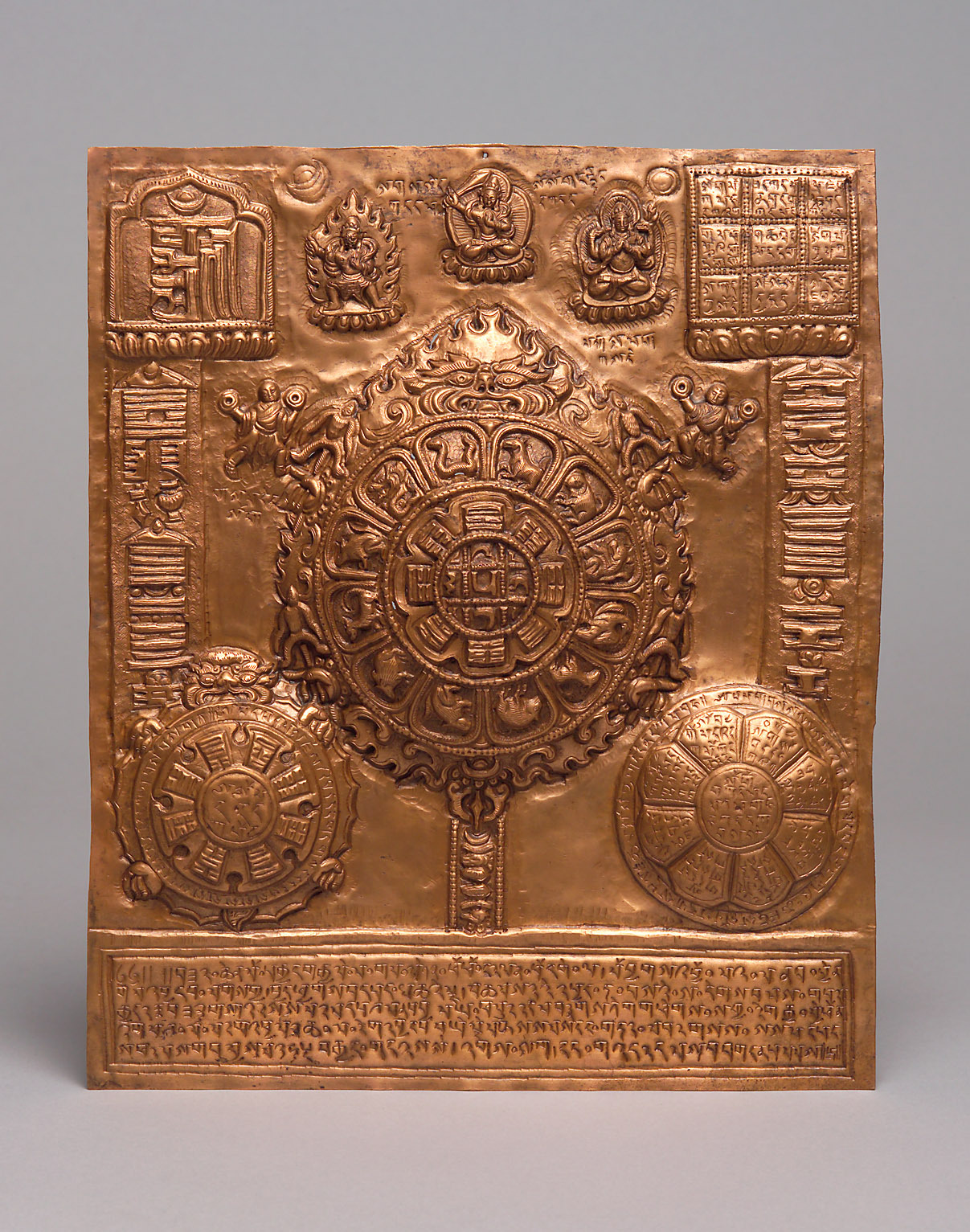 Manjushri, der Bodhisattva der Weisheit, ist auf dieser Kupfertreibarbeit über der Schildkröte Rubal dargestellt. Er hat die astrologischen Lehren zum Wohle der Menschheit mit verschiedensten Diagrammen auf die Bauchseite einer Schildkröte geschrieben. Diese Darstellung, sei sie in Kupfer getrieben oder auf Leinwand gemalt, zeigt zwar alle Komponenten astrologischer Berechnungen wie Diagramme oder Kalkulationstafeln, wird aber nicht für die eigentlichen astrologischen Berechnungen herangezogen. Sie ist vielmehr wie ein Amulett zu verstehen, das vor schädlichen astrologischen Einflüssen schützt.