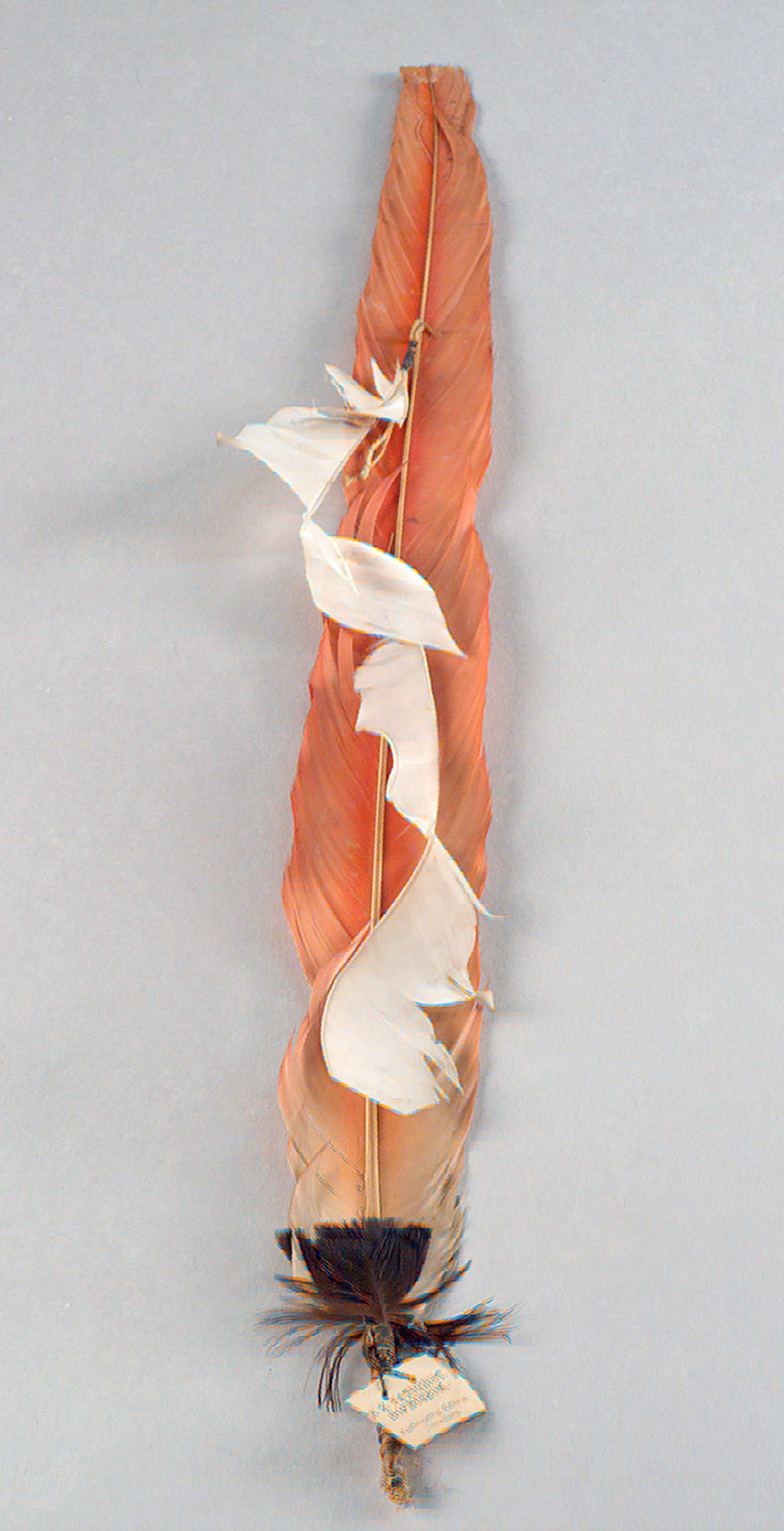 Feder des Hellroten Aras, Federn des Silberreihers, Flaumfedern des Hokkohuhns, Baumwolle, Pflanzenfasern