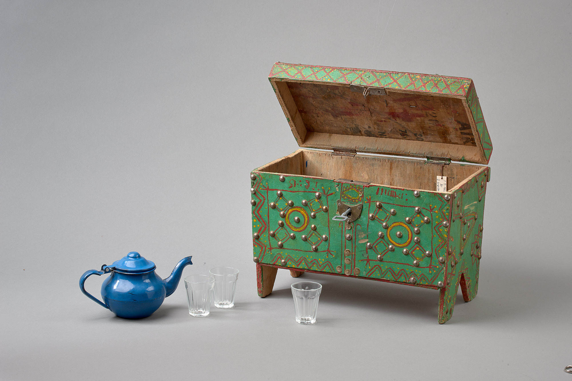 Tamanrasset. Die Wüstenoase am Rand des Ahaggar-Gebirges ist die letzte große Stadt in Algerien vor den Grenzen nach Niger und Mali. Mondlandschaft und Tuareg. Ein Wanderschmied fabriziert aus den Spannplatten einer unnütz gewordenen Verpackungskiste eine Schatulle. Er kommt aus Mali und arbeitet vorübergehend in Tahaggart am Rande der Oase. Das Kästchen verziert er nach der tradierten Farb- und Musterpalette: grün, gelb und rot, Rauten, Kreise, Dreiecke, Wellenlinien. Er schmückt es zusätzlich auf allen Seiten mit Nieten. Zum Abschluss signiert er sein Werk: „Ich, Bilan, Sohn des Shakany, habe es gemacht.“ Das Kästchen ist zur Aufbewahrung von Frauenschmuck gedacht. Man kann aber auch ruhig Teezubehör darin verstauen. So steht es zumindest im Inventarband. In einem Geschäft in Tamanrasset erwirbt die Sammlerin daher noch industriell gefertigte Teegläser und eine kleine bauchige Teekanne aus blauem Email. Billigimportware, wie sie auch von den Tuareg im Alltag verwendet wird.