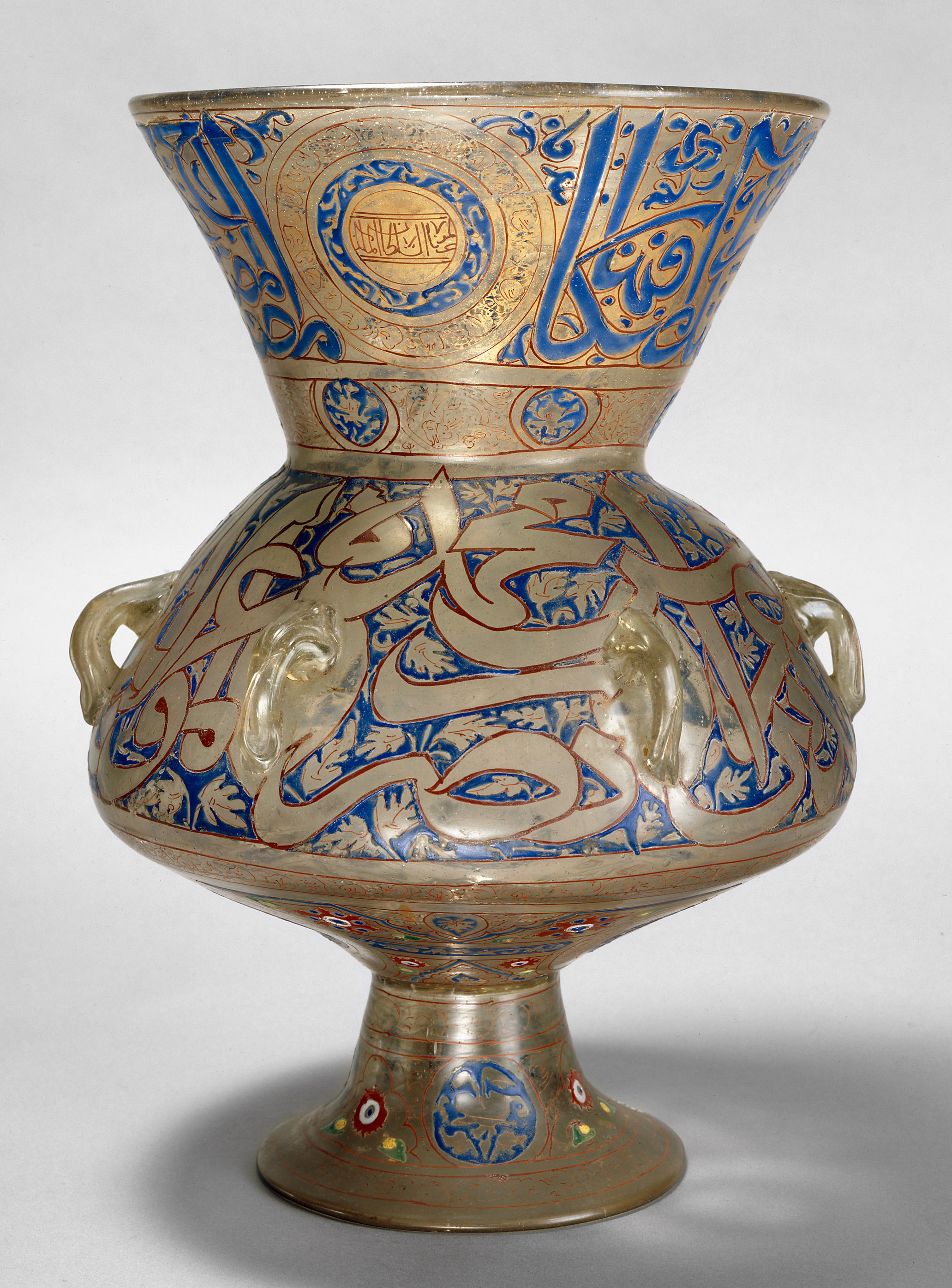 In den Jahren 1356 bis 1363 lässt sich Sultan an-Nasir al-Hasan in Kairo eine Moschee errichten. Sie gilt zu ihrer Zeit als die größte der Welt. Er staffiert sie üppigst mit Moscheeampeln aus emailliertem Glas aus. Die hervorragendsten Moscheeampeln stammen aus den Werkstätten von Aleppo und Damaskus, deren Ruf weit über die Länder des Islam bis ins Abendland und nach China reicht. Einem Sternenhimmel gleich hängen sie in der Moschee an dünnen Bronzeketten von der Decke. Sie schmücken den Raum mehr als sie ihn beleuchten. Der religiösen Umgebung entsprechend, ist ihre Verzierung sparsam: etwas elegantes Rankenwerk, die Anfangszeile des berühmten Lichtverses aus dem Koran, eine Widmung an den ruhmreichen Stifter. Zusammen mit seinem Wappen sollen die Moscheeampeln von seiner Großzügigkeit und seinem Reichtum künden. Zwei dieser kostbaren Moscheeampeln hat Erzherzog Ferdinand Max, der spätere Kaiser von Mexiko, vermutlich 1855 von einem Flottenbesuch der k. k. Kriegsmarine aus Ägypten mitgebracht und mit diesen bei Triest einen der Prunkräume seines Lustschlosses bereichert.