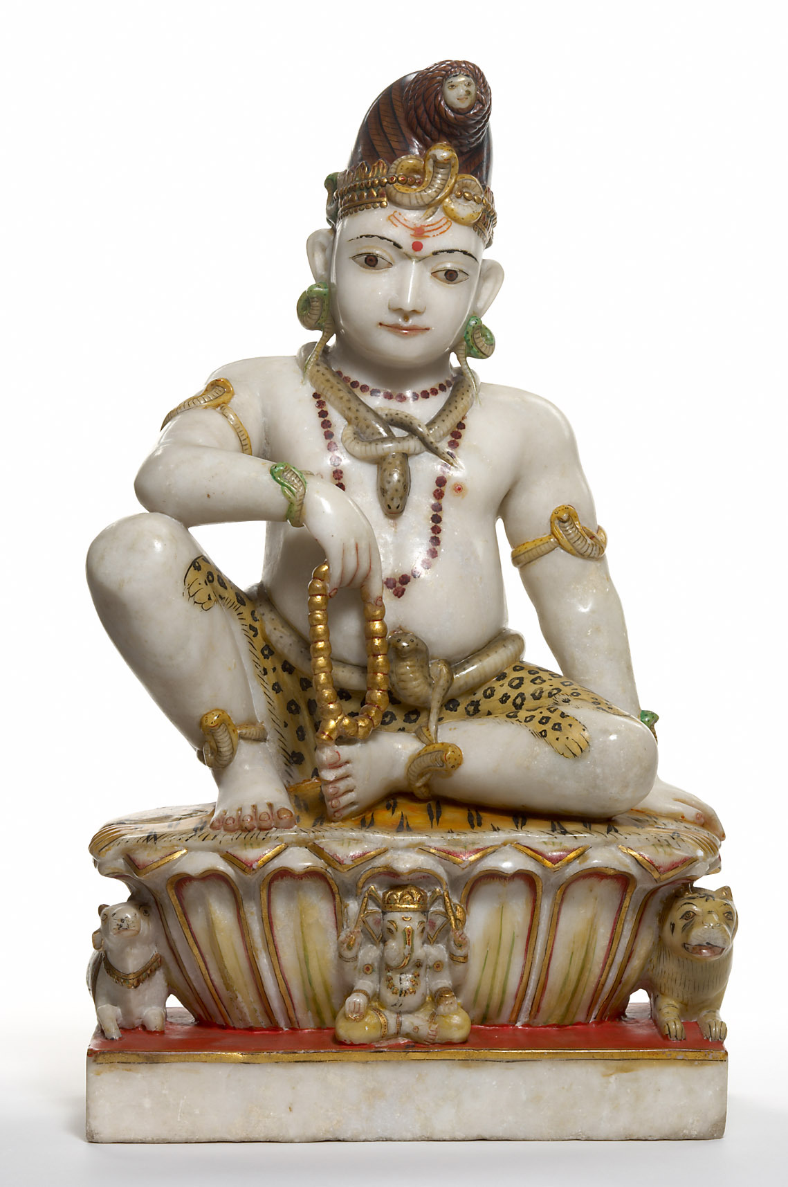 Shiva, dem Herrn über Beginn und Ende der Zeitzyklen, wird in den heiligen Texten die dreifache Kraft des Erschaffens, Erhaltens und Zerstörens zugeschrieben. Wenngleich Shiva so wie alle anderen indischen Gottheiten auch jenseits von Namen und Formen existiert, manifestiert er sich zum Segen der Menschheit doch in zahlreichen parallelen Existenzen mit jeweils spezifischen Namen und oft widersprüchlichen Eigenschaften. Das zu einem Knoten hochgesteckte Haar und die Bekleidung aus Tierfellen weisen Shiva in dieser Darstellung als asketischen Yogi aus. Das dritte Auge auf seiner Stirn gilt als Auge der Erkenntnis, strahlt aber auch zerstörerische Kraft aus. Um seinen Hals, seine Hüften und seine Oberarme winden sich Schlangen, die ihn als „Überwinder“ des Todes kennzeichnen. Der Stier Nandin dient Shiva als Reittier, während der elefantenköpfige Ganesha in der Mitte des Lotussockels als sein Sohn verehrt wird.