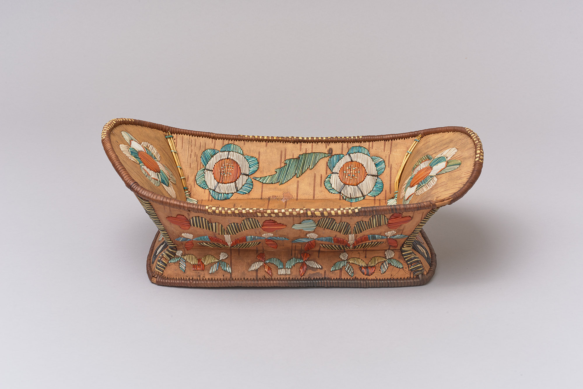 Birkenrinde, gefärbte Stachelschweinborsten, Wurzelfasern, Flachstickerei