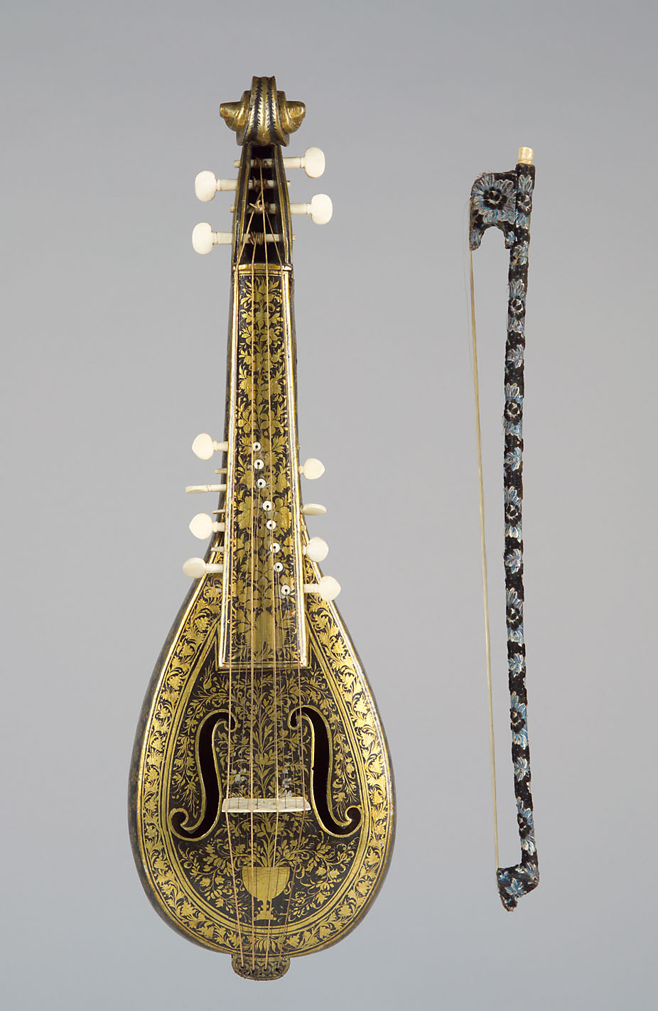 Holz, Lack, Bein, Metall- und Sehnensaiten, (Bogen:) Textil, Haar
