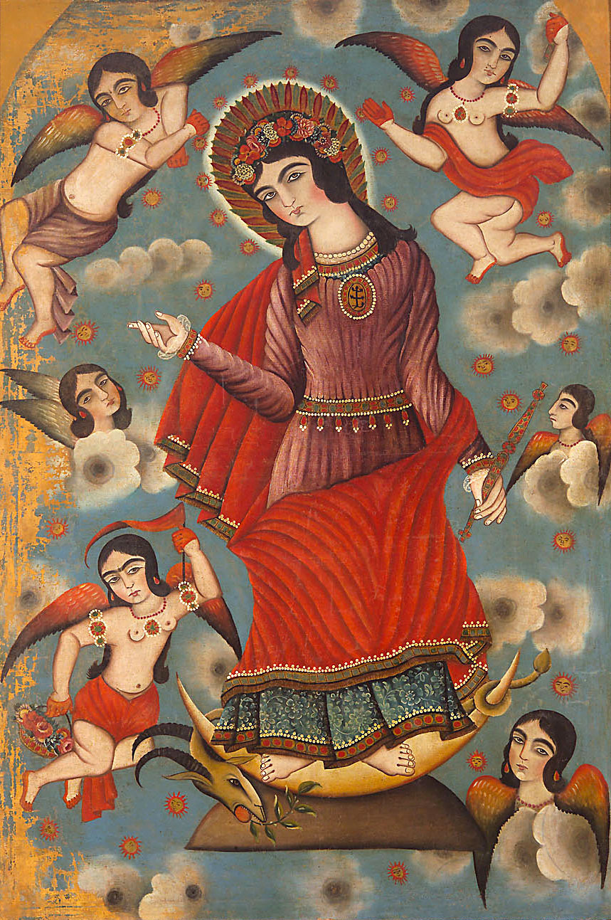 Das Ölbild aus der Qadscharenzeit zeigt die sternenbekrönte Jungfrau Maria auf der Mondsichel stehend. Seit dem 17. Jahrhundert sind im Iran unzählige Drucke mit christlich-religiösen Motiven aus der europäischen Kunstgeschichte in Umlauf. Diese werden nicht einfach kopiert, sondern stets den eigenen religiösen und künstlerischen Vorstellungen angepasst. Maria wird im Koran als einzige Frau namentlich erwähnt. Sure 19 trägt ihren Namen.
