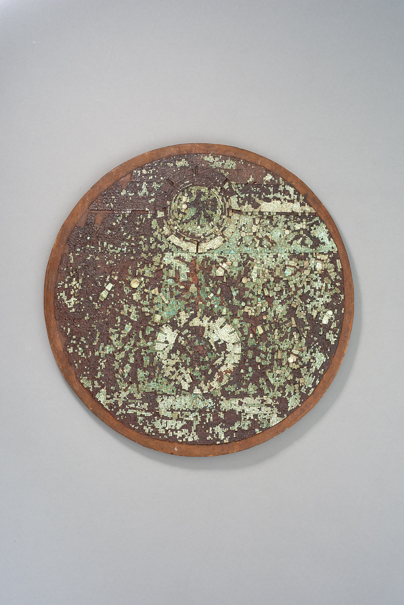 Wie eine europäische Kunstkammer der Renaissance versammelt diese Vitrine Objekte aus Materialien, die bei den Azteken hochgeschätzt waren: zum Beispiel Türkis, Jade, Obsidian, Gold und vor allem bunte Federn. Aus der Sicht der Europäer handelte es sich um exotische Materialien. Und tatsächlich stammen die hier ausgestellten Gegenstände aus den europäischen Raritätenkabinetten, unter anderem aus der berühmten Ambraser Kunstkammer von Erzherzog Ferdinand II., dem Landesherrn von Tirol. So etwa das runde Mosaik aus ursprünglich über 22.000 Steinen. Türkise galten in Mesoamerika als besonders wertvoll, da ihre blau-grüne Farbe das Wasser und damit die Fruchtbarkeit symbolisiert. Ähnliches gilt für den lauchgrüne Jadeit, aus dem Sie rechts daneben eine kleine stehende Figur sehen. Sie stammt aus der Olmekenkultur, die etwa zwischen 1500 und 400 vor unserer Zeitrechnung existierte. Zu den typischen Merkmalen gehören die hochpolierte Oberfläche, die hängenden Mundwinkel und der verhältnismäßig große Kopf. Viel wissen wir allerdings nicht über diese faszinierende Figur:Das ist eine männliche Figur, die Bedeutung ist unbekannt. Ähnliche Figuren sind in Opferdepots gefunden worden. Sie haben eine Rolle gespielt in einem zeremoniellen Kontext. Aber wenn man ehrlich ist, ist eigentlich sehr wenig über diese Kultur bekannt. Also man kann fantasieren, aber das ist eigentlich nicht korrekt.