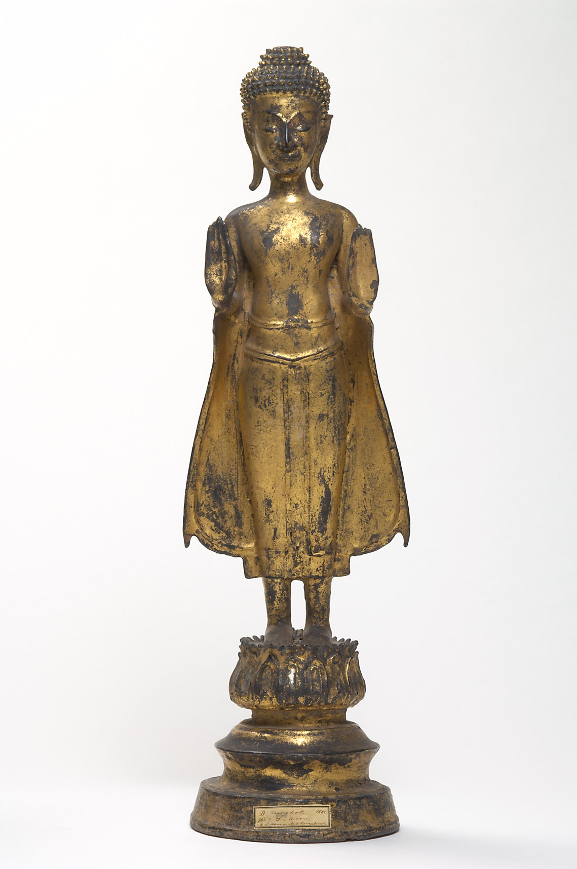 Buddha steht auf einem runden Lotussockel, beide Hände zur Geste “abhaya mudra“ erhoben. Diese Handhaltung der Besänftigung des Wassers oder der Flut fand in der Zeit des Bangkok-Stils große Beliebtheit. Die Gesichtszüge verweisen, ebenso wie die Art der Gewandung, auf die Kunst Ayuthyas, der ehemaligen Hauptstadt, die im 18. Jahrhundert die Metropole Südostasiens war. Die Künstler Bangkoks haben die Tradition Ayuthyas zumindest zu Beginn weitergeführt.