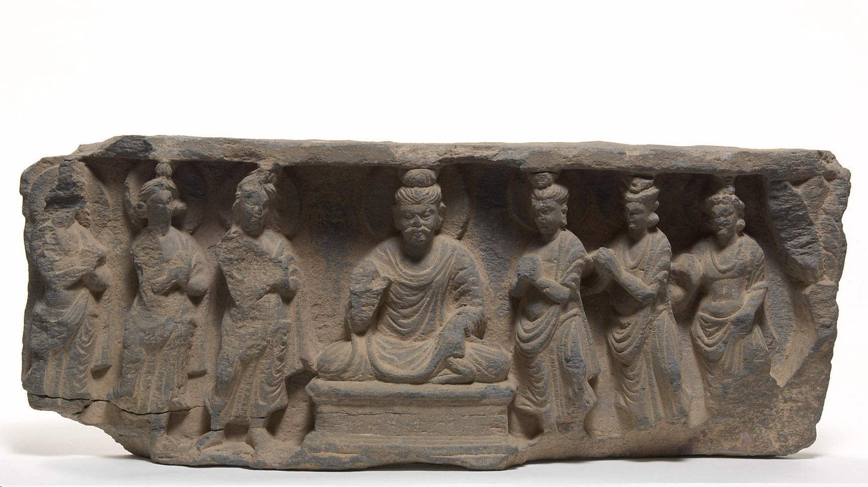 Buddha sitzt in tiefer Meditation auf einem Thron, sein Haar zum Knoten der Asketen aufgebunden. Links neben Buddha steht der indische Gott Brahma, rechts Indra, beide die Hände zum Gebet gefaltet. Dies deutet darauf hin, dass sie ihn auffordern zu predigen.