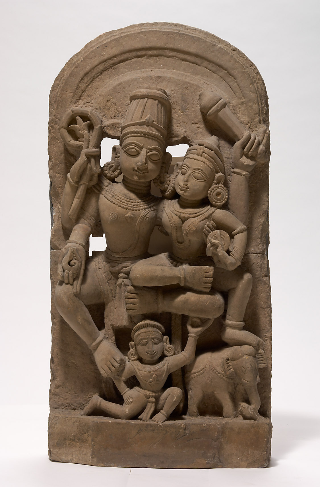 Vishnu in seiner Erscheinung als höchstes transzendentes Wesen Narayana umarmt Lakshmi, die weibliche Verkörperung seiner schöpferischen Kräfte. Als eigenständige Göttin wird sie als Spenderin von Glück, Wohlstand und Fruchtbarkeit verehrt. Das liebende Paar wird von Garuda, dem Reittier des Vishnu in seiner anthropomorphen Form und einem Elefanten, der auf Lakshmis Funktion als Fruchtbarkeitsgöttin hinweist, gestützt.