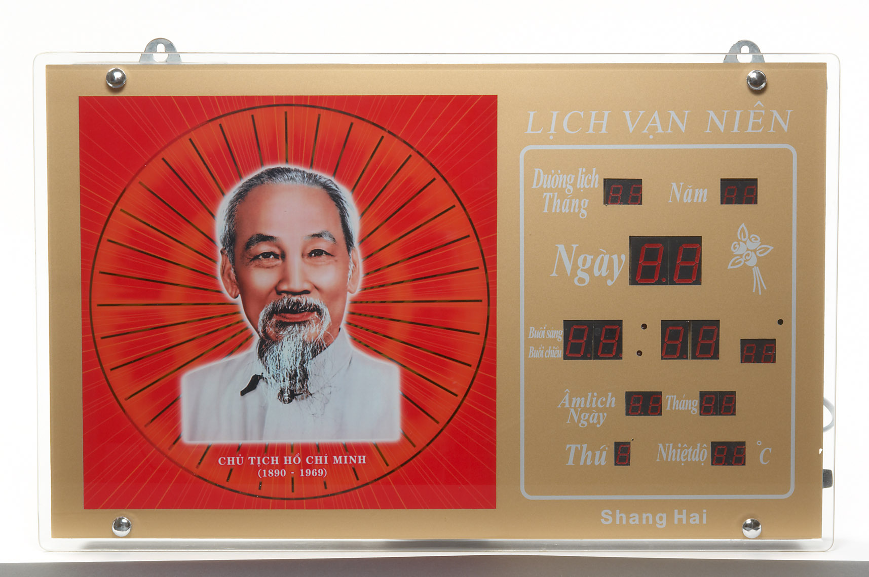 Das Portrait von Ho Chi Minh ziert auch viele Gegenstände des Alltags, so wie hier einer elektronischen Kalenderanzeige.
