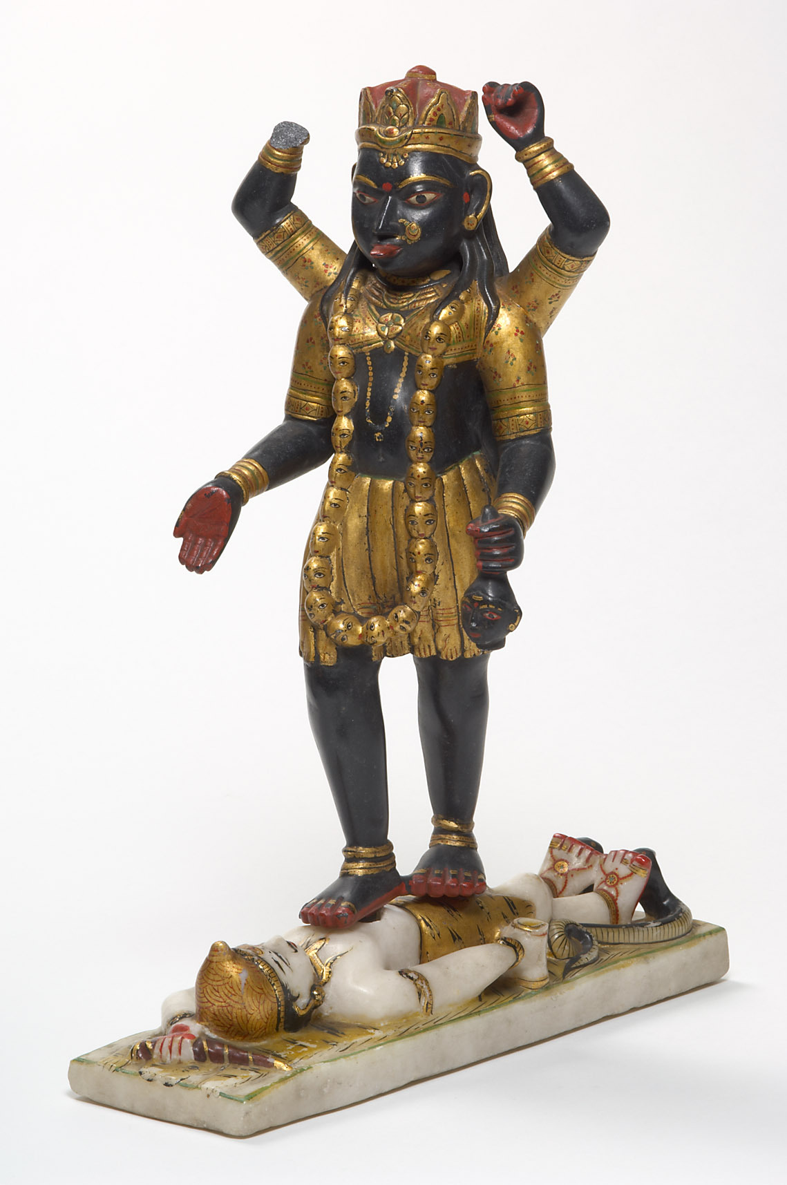 In Kali, der blutdürstigen „Schwarzen“, zeigt sich die Göttin Devi in ihrer erschreckendsten Manifestation. Ihre Erscheinung, auf dem Gott Shiva stehend, verweist auf ihre übergeordnete kosmische Macht, mit der sie alle Götter in sich aufnimmt und über sie hinausgeht. Nur durch sie als aktives Prinzip kann Shivas transzendentale Macht zur Wirksamkeit gelangen.